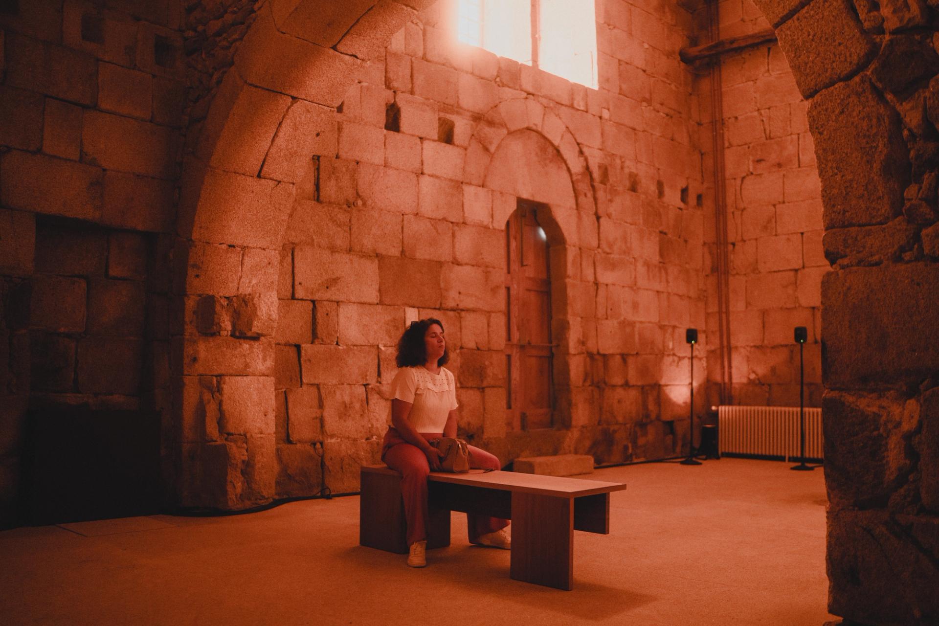 A guest sits in the renovated monastery and experiences Diana Policarpo's sound installation Courtesy Livraria Lello Foundation