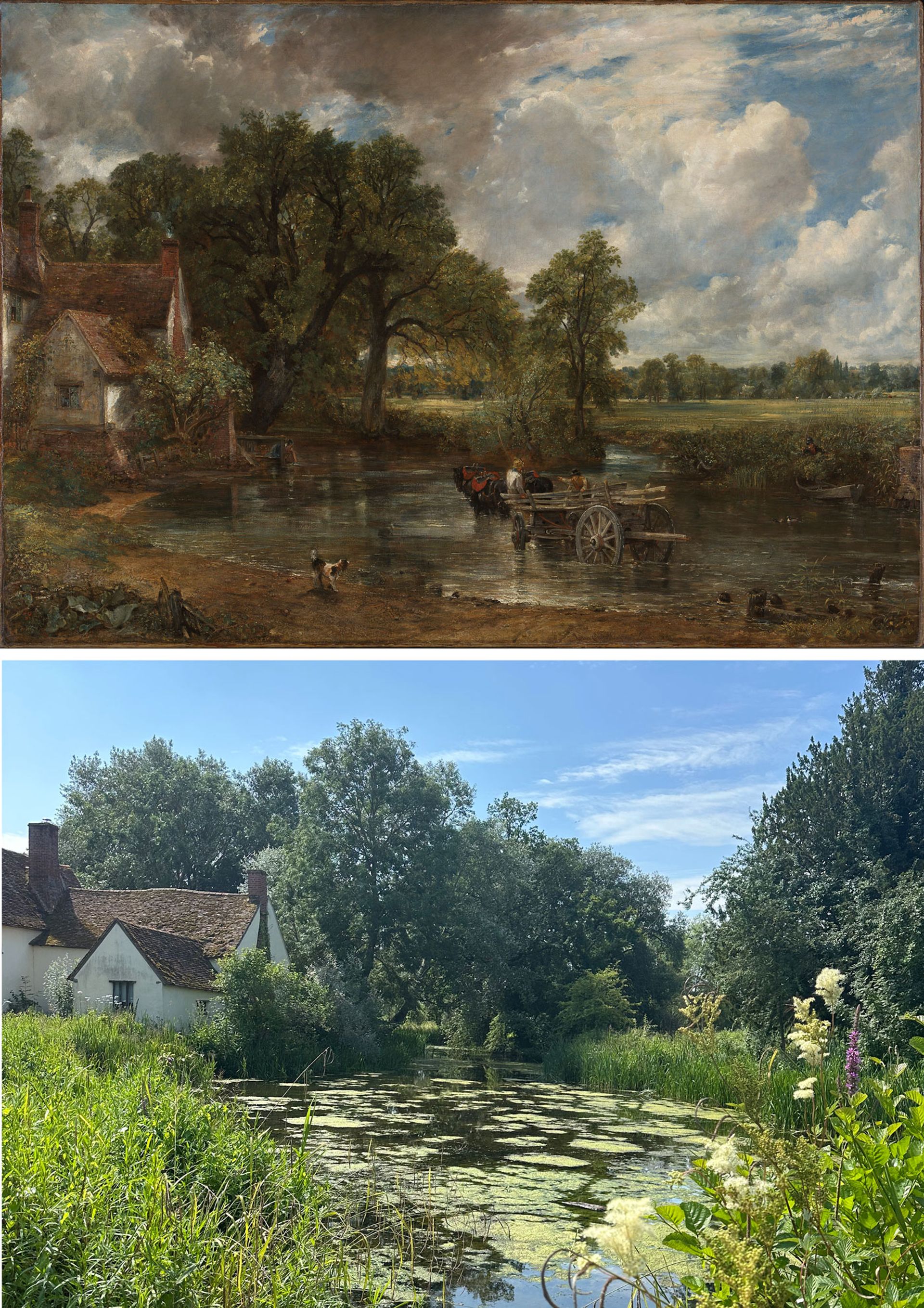 John Constable, The Hay Wain (1821), top, and the scene on the river Stour in Suffolk today with Willy Lott's house to the left Constable: The National Gallery, London. Photograph: Gareth Harris / The Art Newspaper