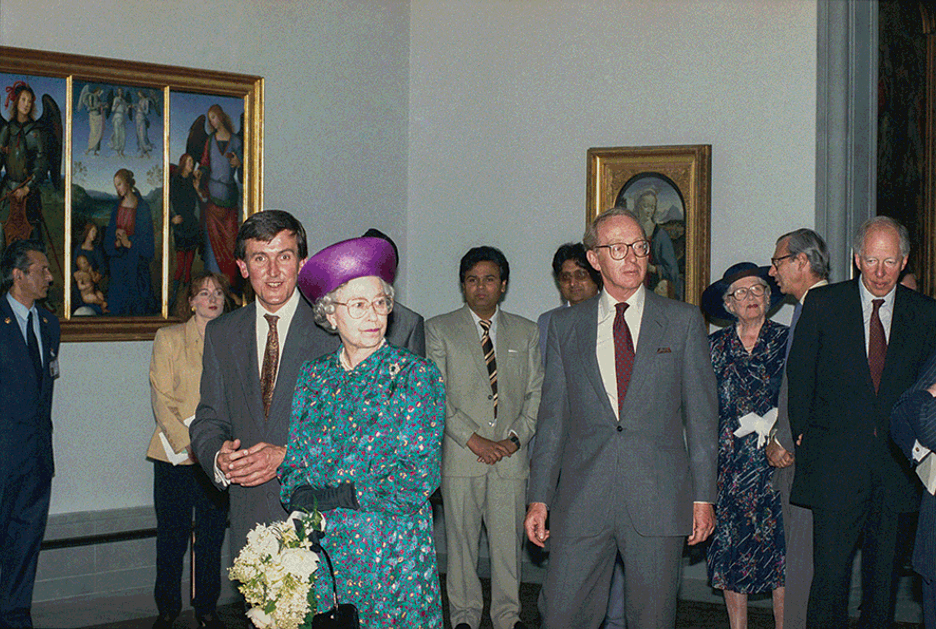 Queen Elizabeth II at the opening of the Sainsbury Wing in July 1991, with Neil MacGregor (left) and Jacob Rothschild (far right)—then director and chairman of the National Gallery—and two of the three donor brothers, Simon Sainsbury (centre) and Tim Sainsbury (second right)