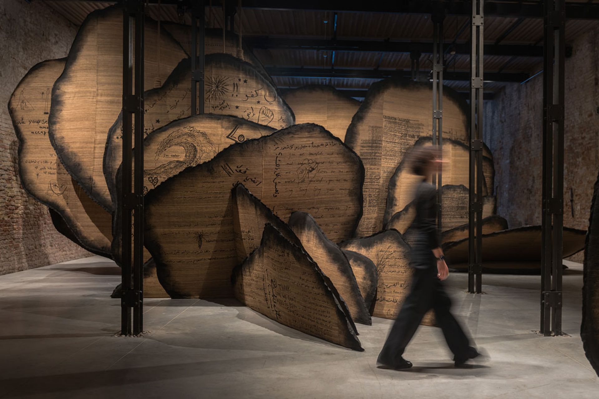 Installation view of Manal AlDowayan's installation Shifting Sands: A Battle Song (2024) Photo: Venice Documentation Project. Courtesy of the Visual Arts Commission, the Commissioner for the National Pavilion of Saudi Arabia