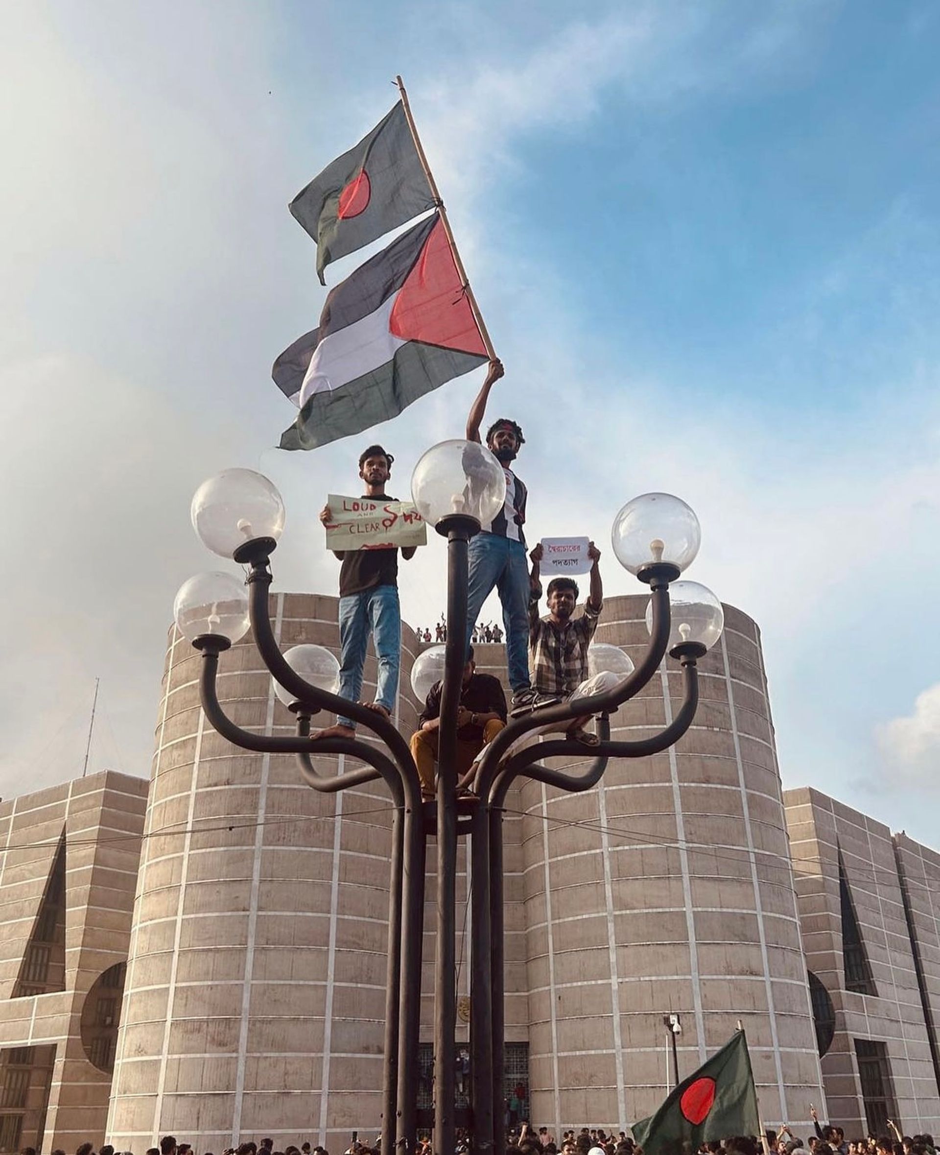 Meanwhile another Bangaldeshi photographer connected to the Pathshala Institute, Munem Wasif, has been capturing the demonstrations on the ground. In an Instagram post on 5 August, Wasif documents a number of young adults atop lampposts and bridges holding the national flags of both Bangladesh and Palestine, drawing connections between the upheaval in Dhaka and the ongoing war in Gaza.