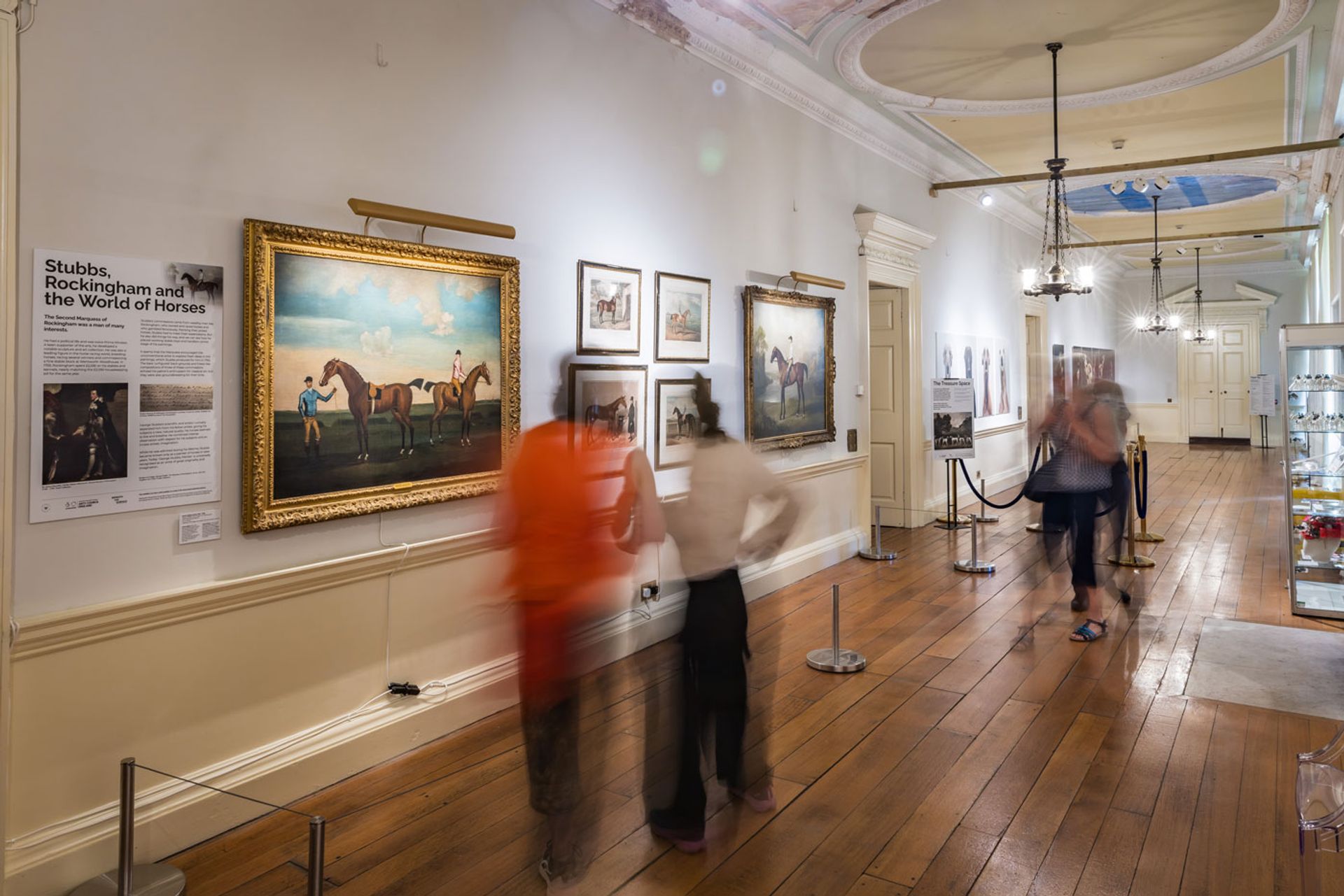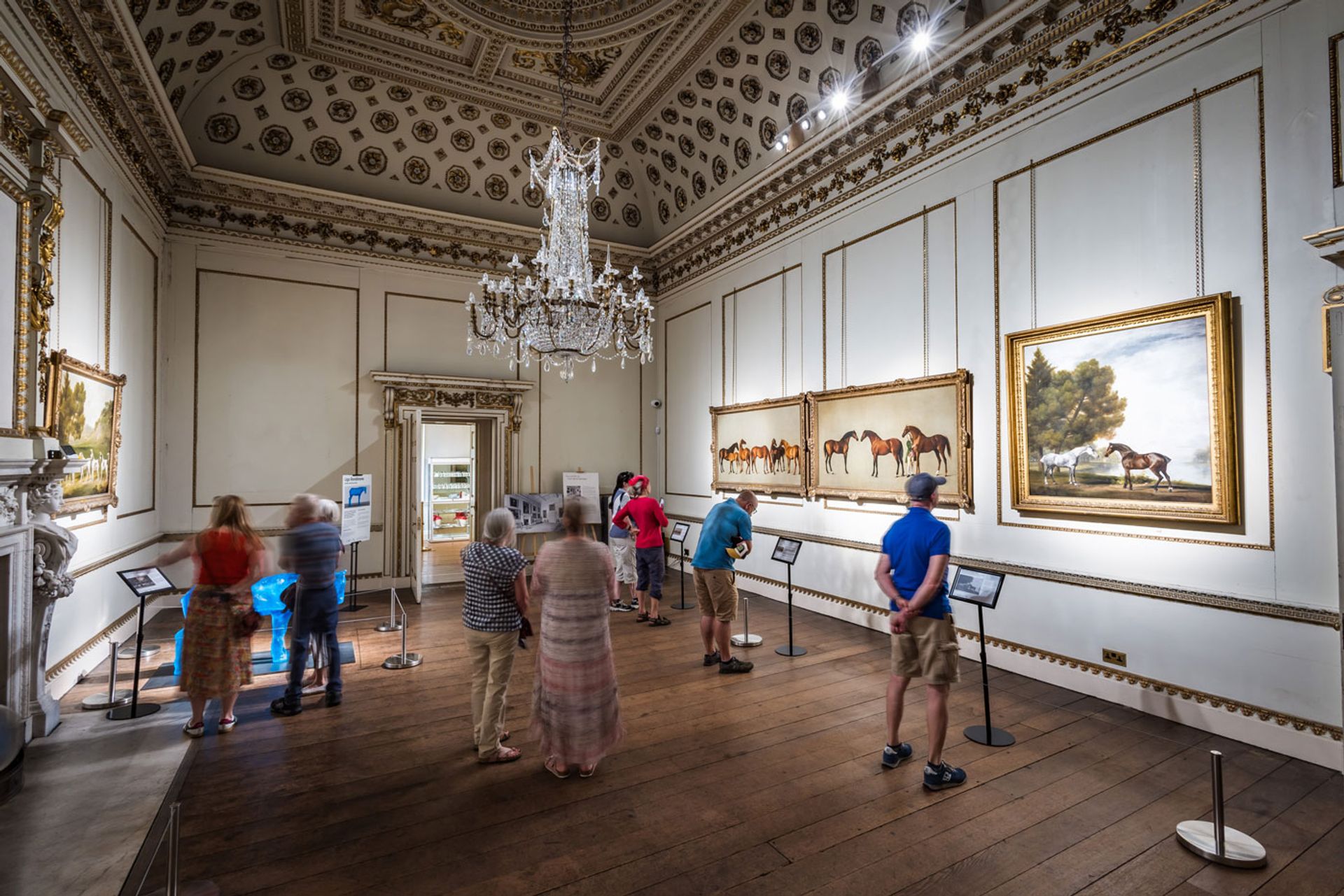 Three works by George Stubbs installed in the Van Dyck Room at Wentworth Woodhouse. Under the terms of the government indemnity scheme applied to a listed building, the pictures are hung on chains from existing holes set into the historic panelling Photograph: James Mulkeen