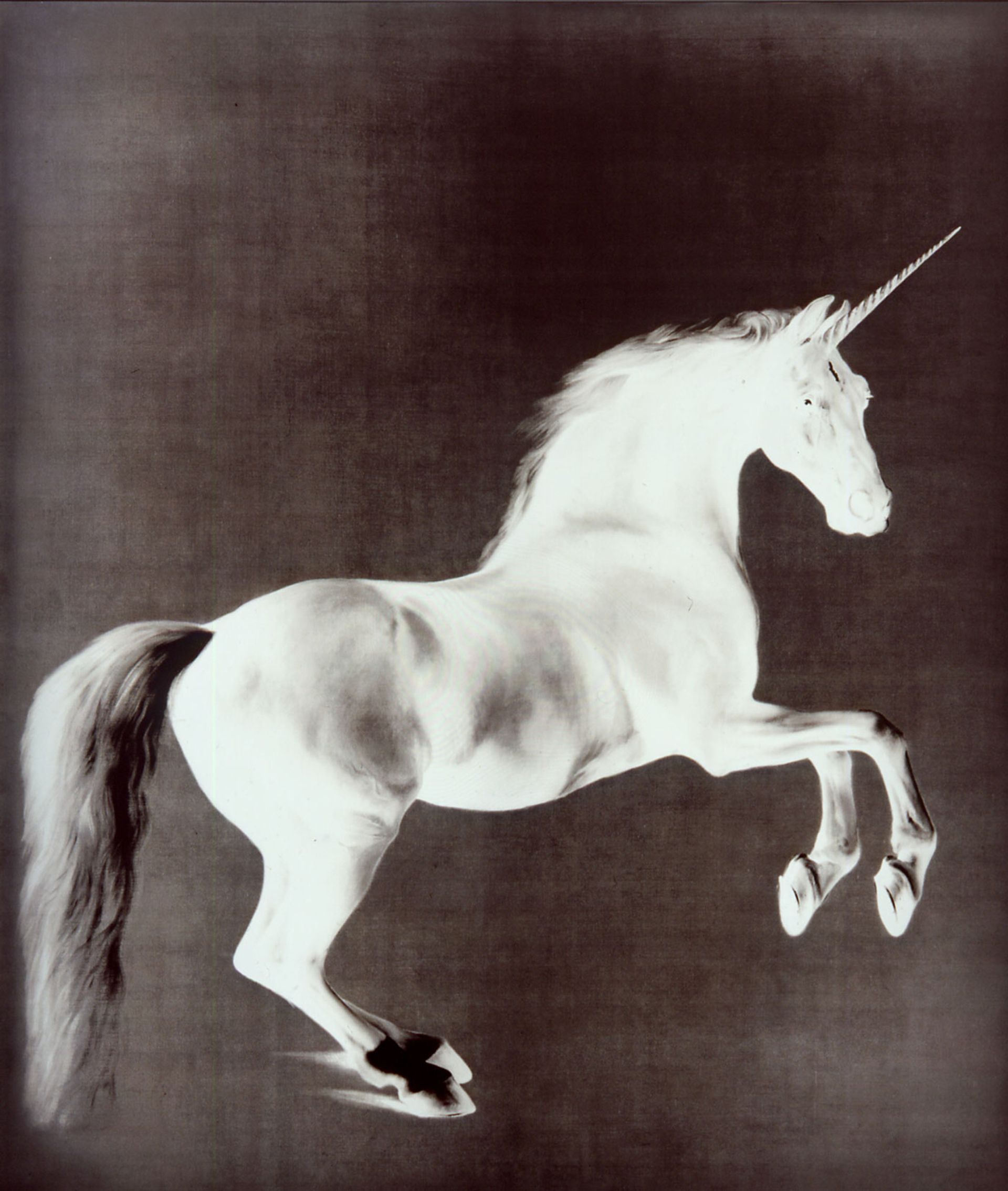 Whistlejacket has stayed at the National Gallery for that institution’s bicentenary celebrations and the artist’s tercentenary—it will keep its axial pride of place when the collection is rehung over the next seven months—but a copy of the painting has long since been painted where the picture once hung in the Whistlejacket Room at Wentworth Woodhouse, one of the four spaces devoted to Beneath the Surface. Wallinger has lent a version of Ghost (2001) his celebrated remediation of Whistlejacket: a monochrome negative image of the stallion with a narwhal’s tusk added in picture editing software to create a mythical reimagination of stallion as unicorn.