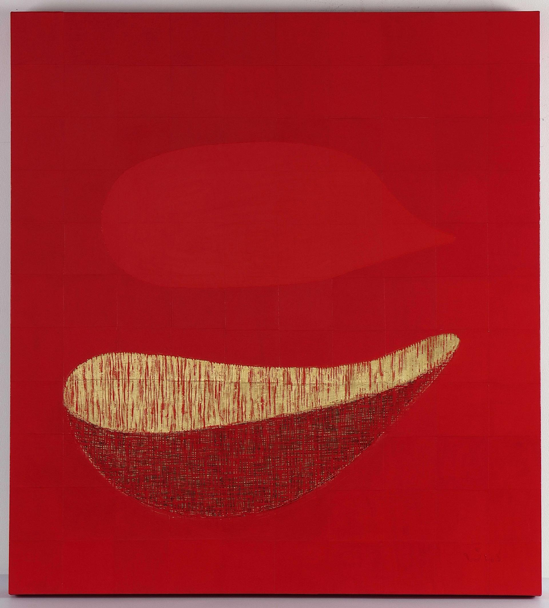 “They have a lot of symbolic aspects that intrigued me,” she says. “Sufis carry them around, but they don’t put anything in them. They are a place for receiving and giving, and that connects with my practice.” Her canvases feature vessel-like or natural shapes surrounded by a rich red, carrying their own sense of open-ended spirituality.