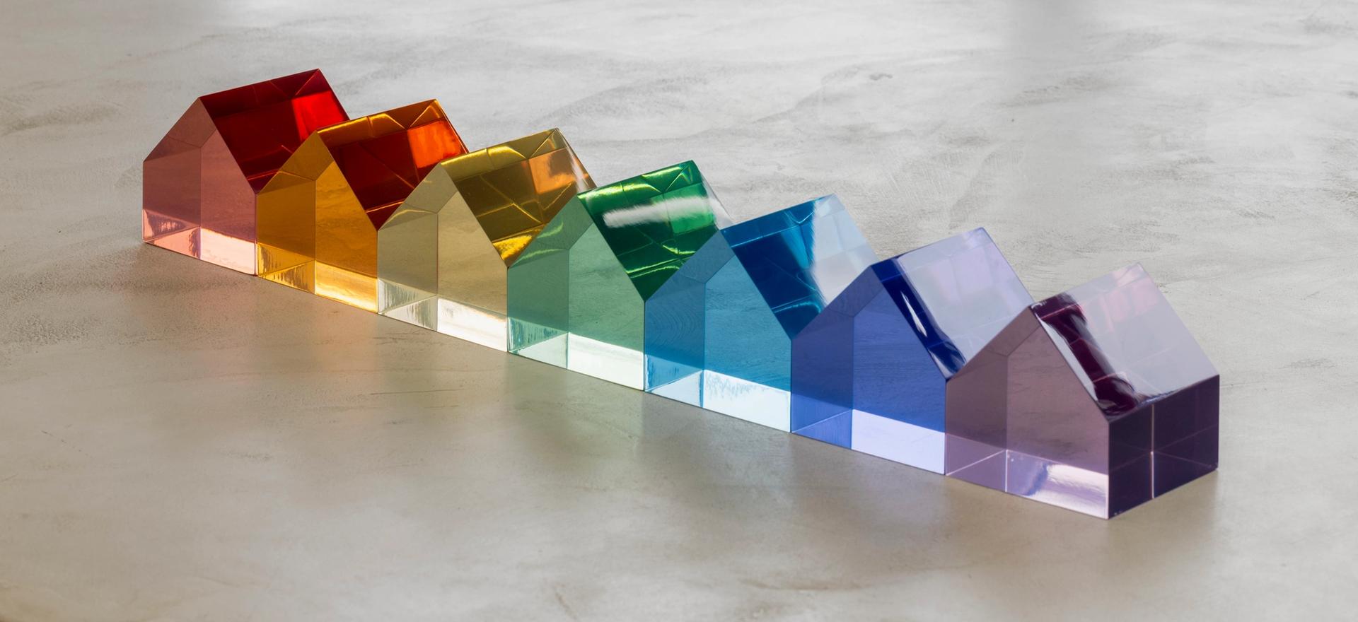 Rahmoun presents four works in Paris, including the new Markib-Habba (Seed-Boat), whose geometric metal structures reference a boat, a symbol, he says, of “an inner journey”, as well as a prism, representing a person in meditation, with a sphere in the middle. A second work, Manzil-Tayf (House-Spectrum) (2021), is a grouping of seven transparent resin houses, each a different hue. The houses represent a “refuge”, Rahmoun says, where a person “can be in harmony with themselves”.