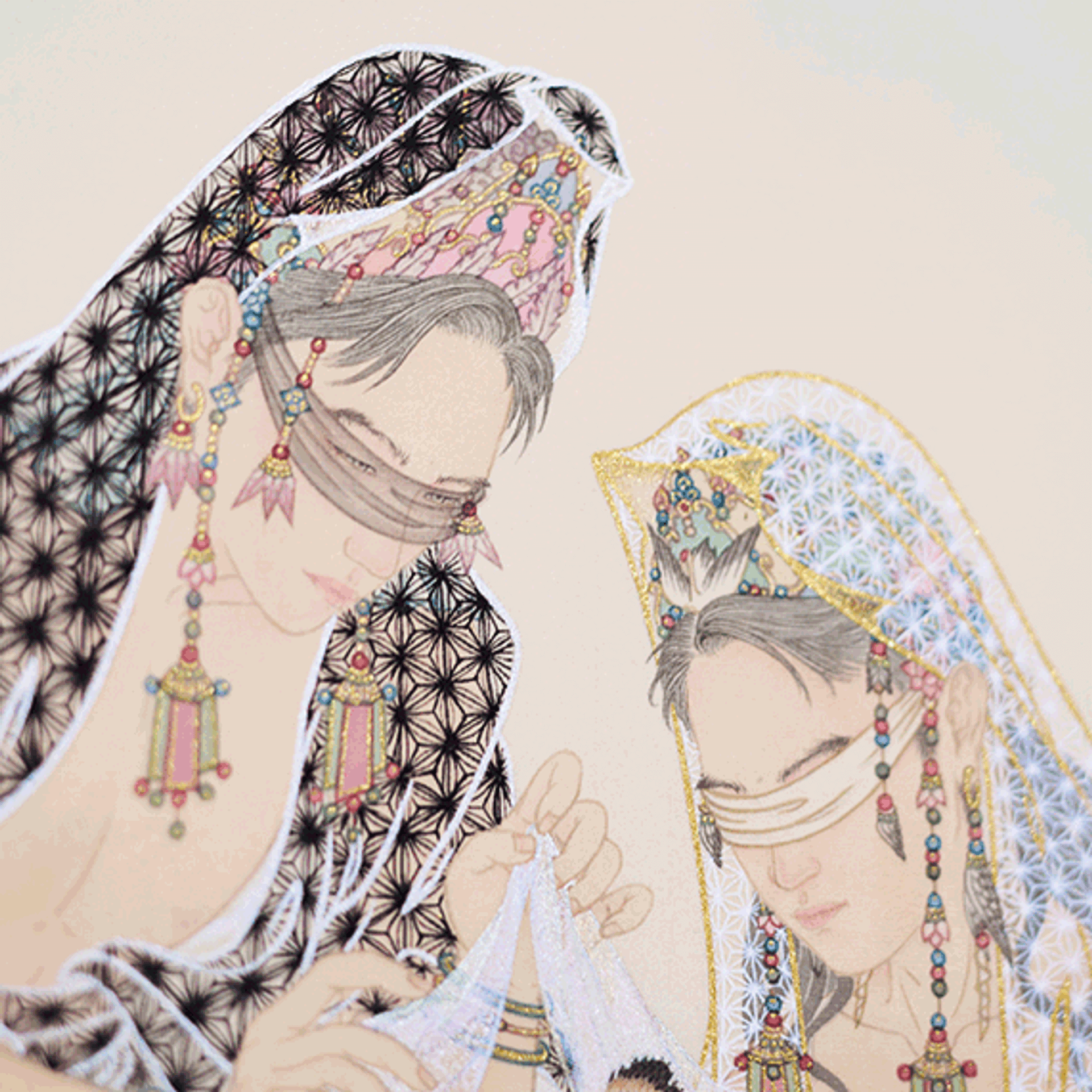 박그림의 〈이간(二揀)〉(2024) 작품 부분 이미지. 서울 갤러리 띠오에서 2024년 개최된 작가의 개인전 《사사 四四》에 출품됐다. 작가는 시적 은유와 전통 한국화 기법으로 퀴어의 경험을 드러낸다