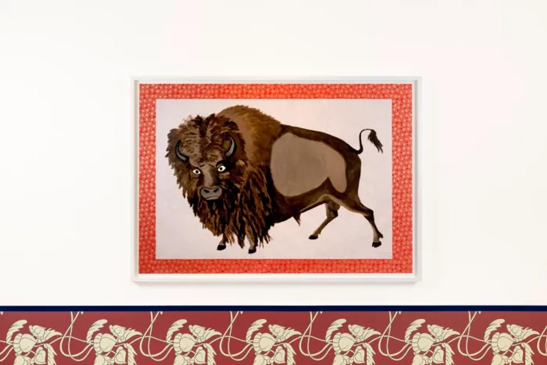 Red Star, whose practice also incorporates painting, photography, textiles and performance, continues this inquiry downstairs at Gathering. There, she is exhibiting the installation Tokens, Gold, & Glory (2016), in which headless hunting decoys of deer wrapped in gold Mylar stand on pallets covered in artificial turf, alongside a series of new buffalo paintings. Each piece foregrounds the falseness of the tropes used by others for centuries to caricature and commodify Indigenous American cultures.