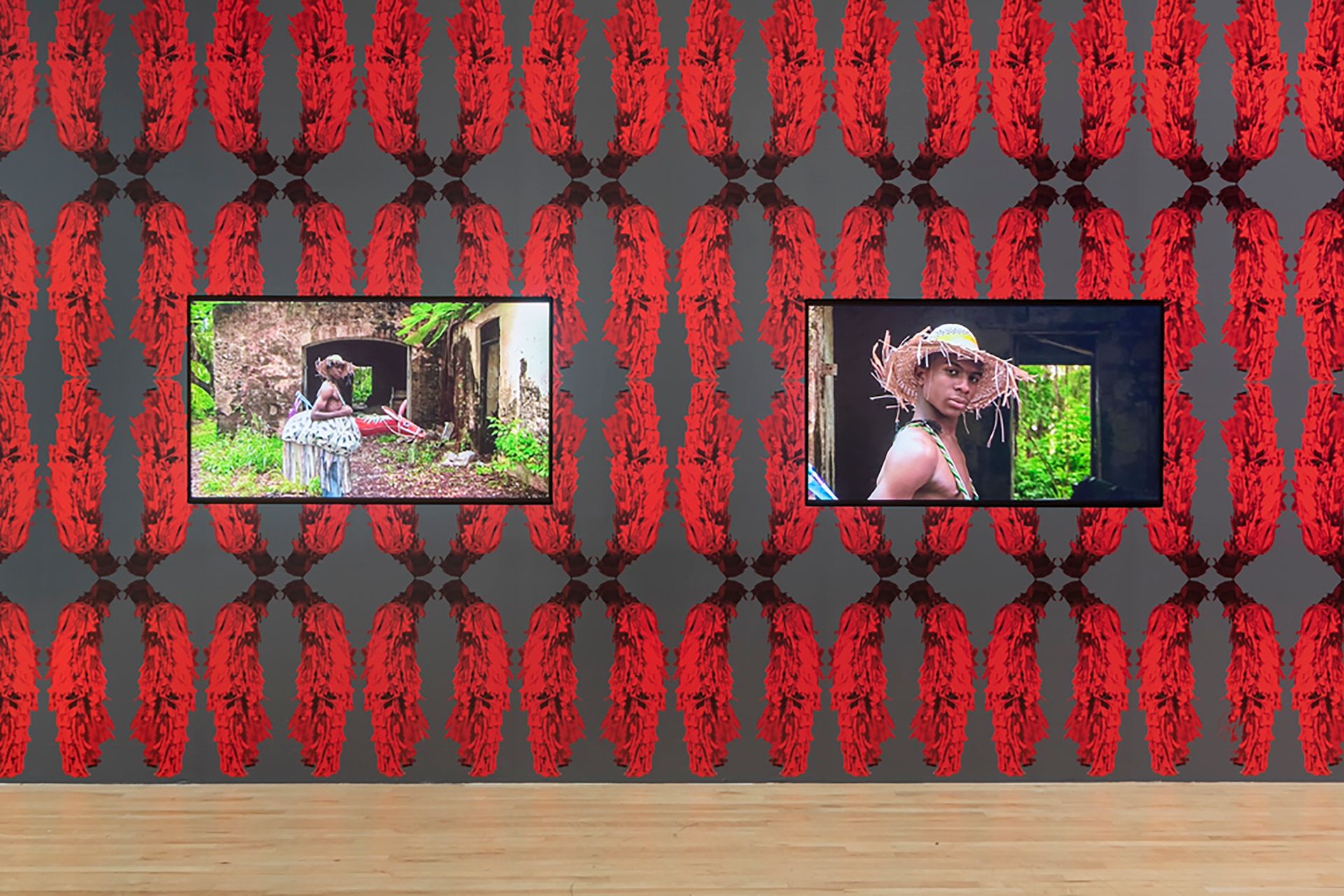 Sonia Boyce, Crop Over, 2007 and Shaggy Bear Wallpaper, 2020. Photo © Tate; Devotional Placards and Wallpaper, 2018. Image: Mike Pollard for Manchester Art Gallery.