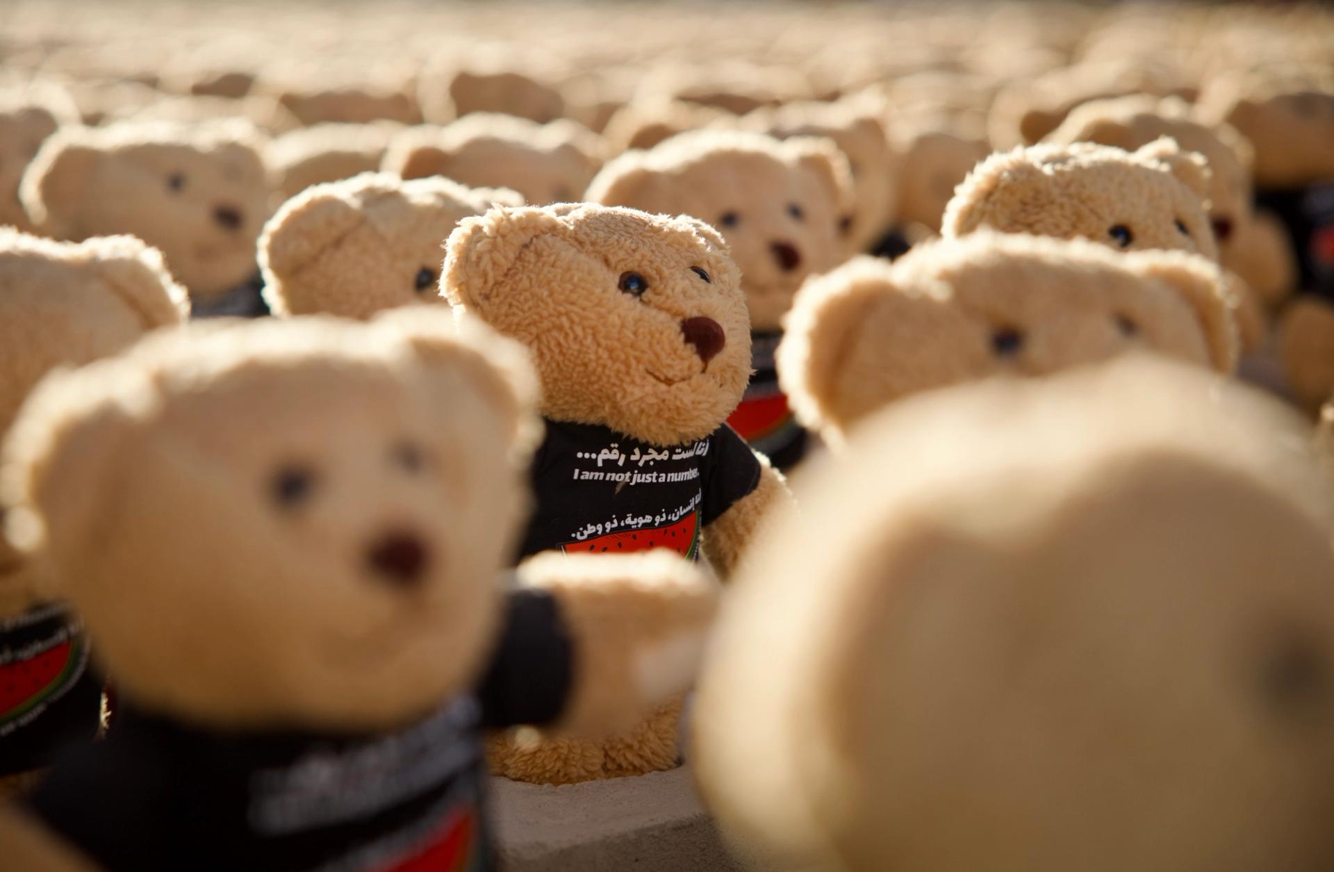 Each of the 15,000 teddy bears is dressed in a black t-shirt emblazoned with the message “I’m not just a number. I’m human. With an identity. With a homeland. I am Palestine. #Free Palestine”