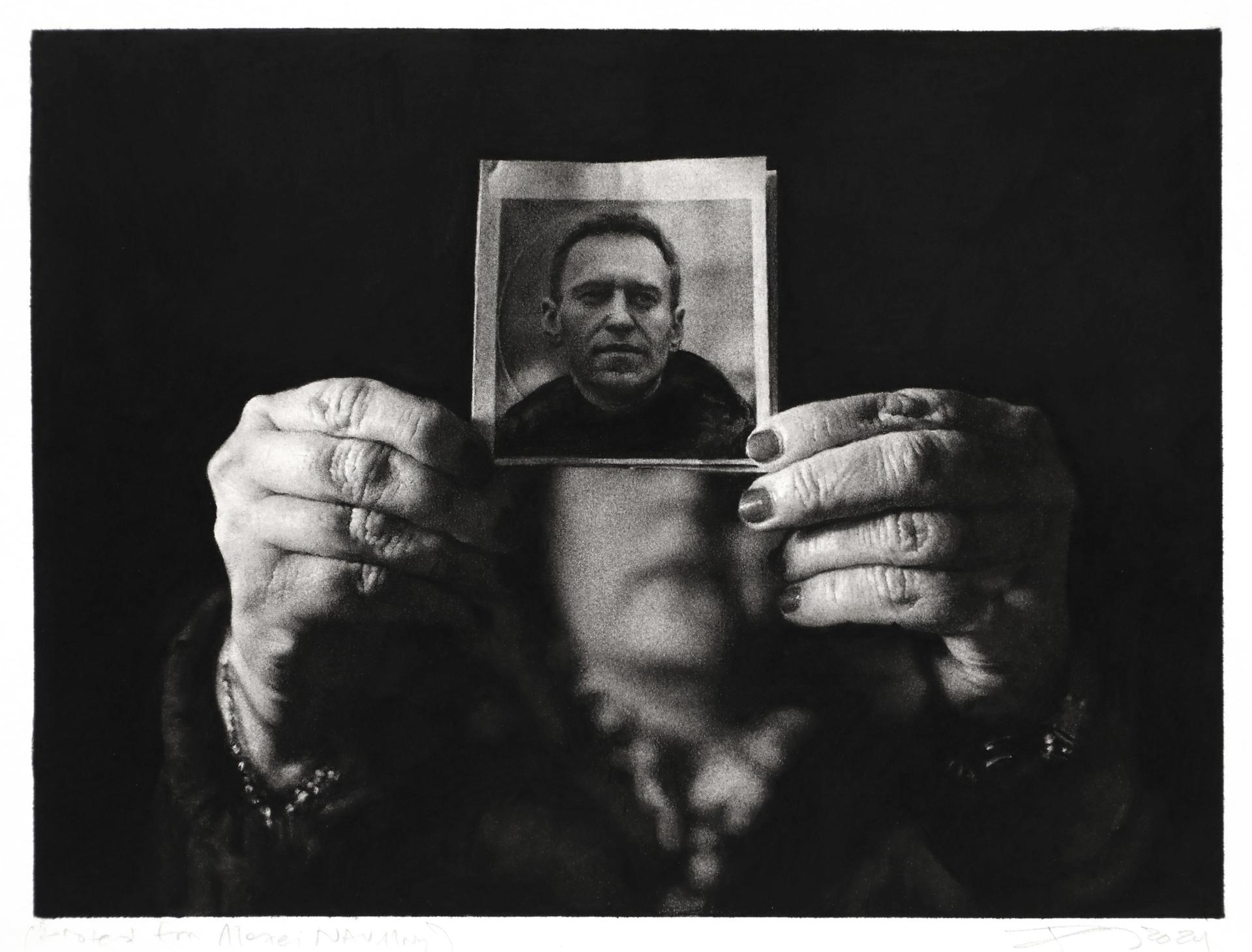 Rally for late Russian opposition leader Alexei Navalny in Athens, Greece - 19 Feb 2024; Based on a photograph by Kostas Tsironis, 2024. Charcoal and graphite on paper