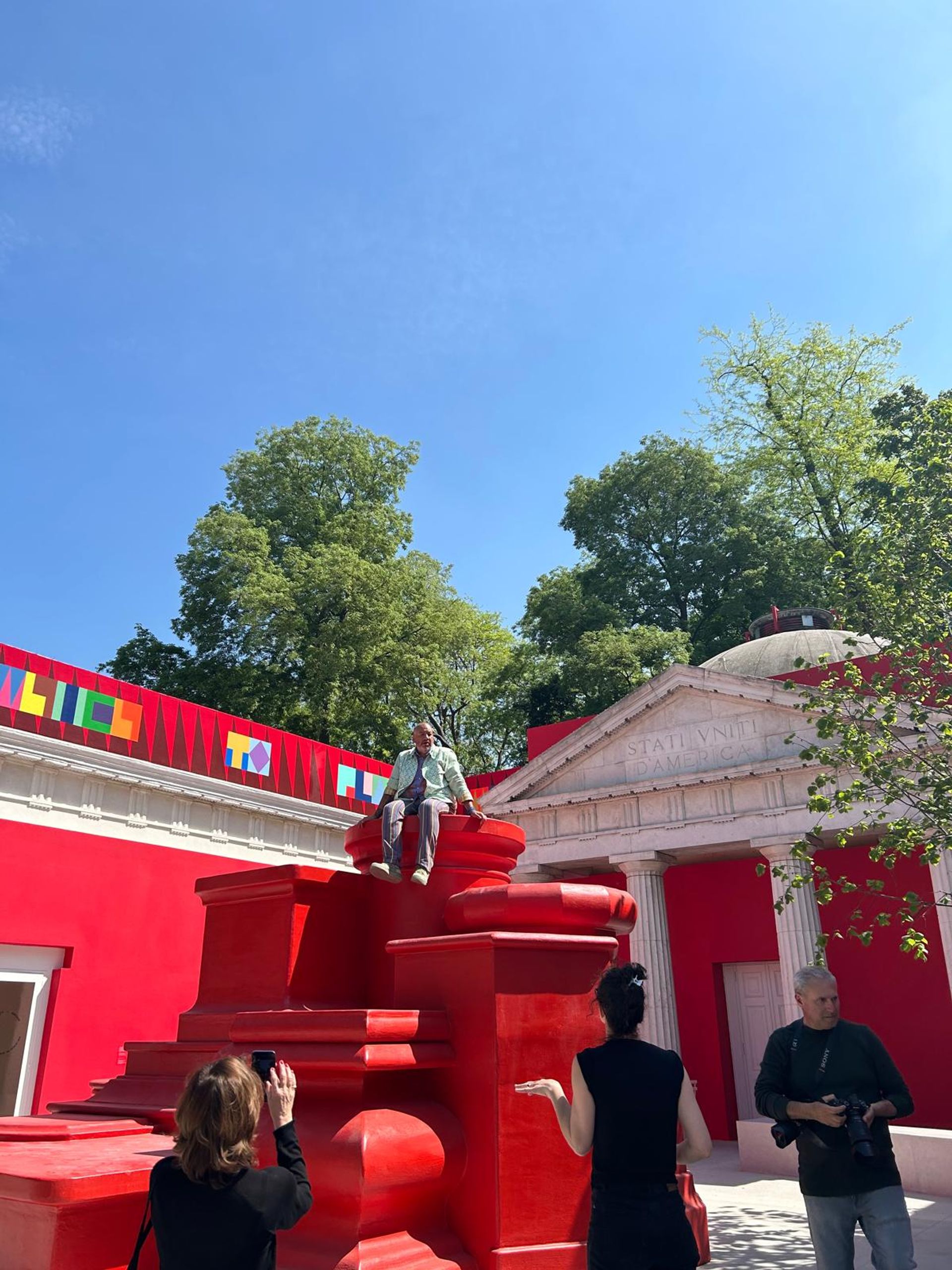 Jeffrey Gibson relaxing on one of his sculptures at the US Pavilion in Venice The Art Newspaper