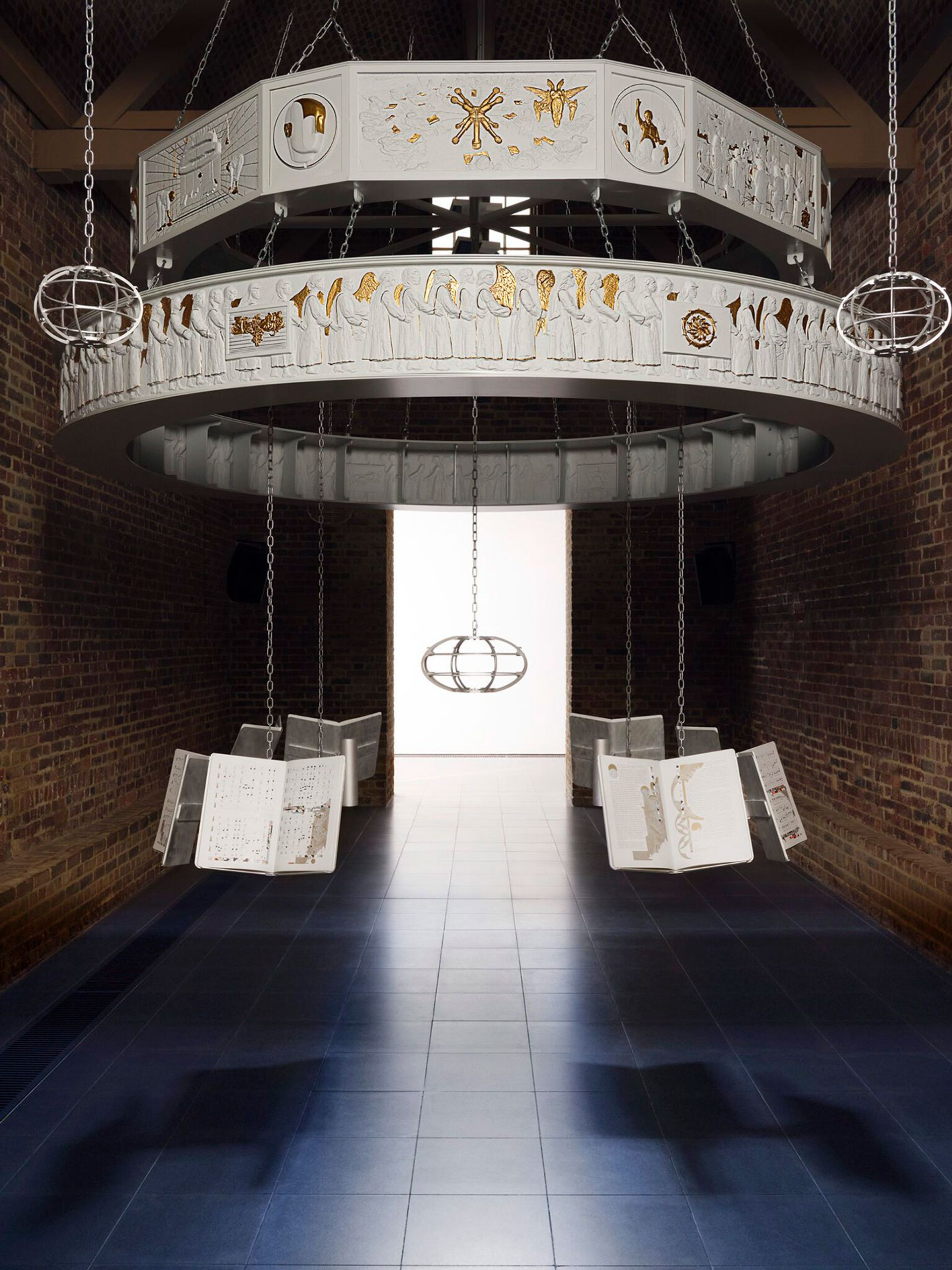"We wanted people to experience what it’s like to stand in the middle of a choir and listen". In one of the chapel-like former gunpowder rooms at Serpentine North, visitors can stand under the Ring, a chandelier-like object devised by the architectural practice sub, surrounded by the sound of multi-part choirs generated by Holly Herndon and Mat Dryhurst's AI choir model © Leon Chew. Courtesy of Serpentine