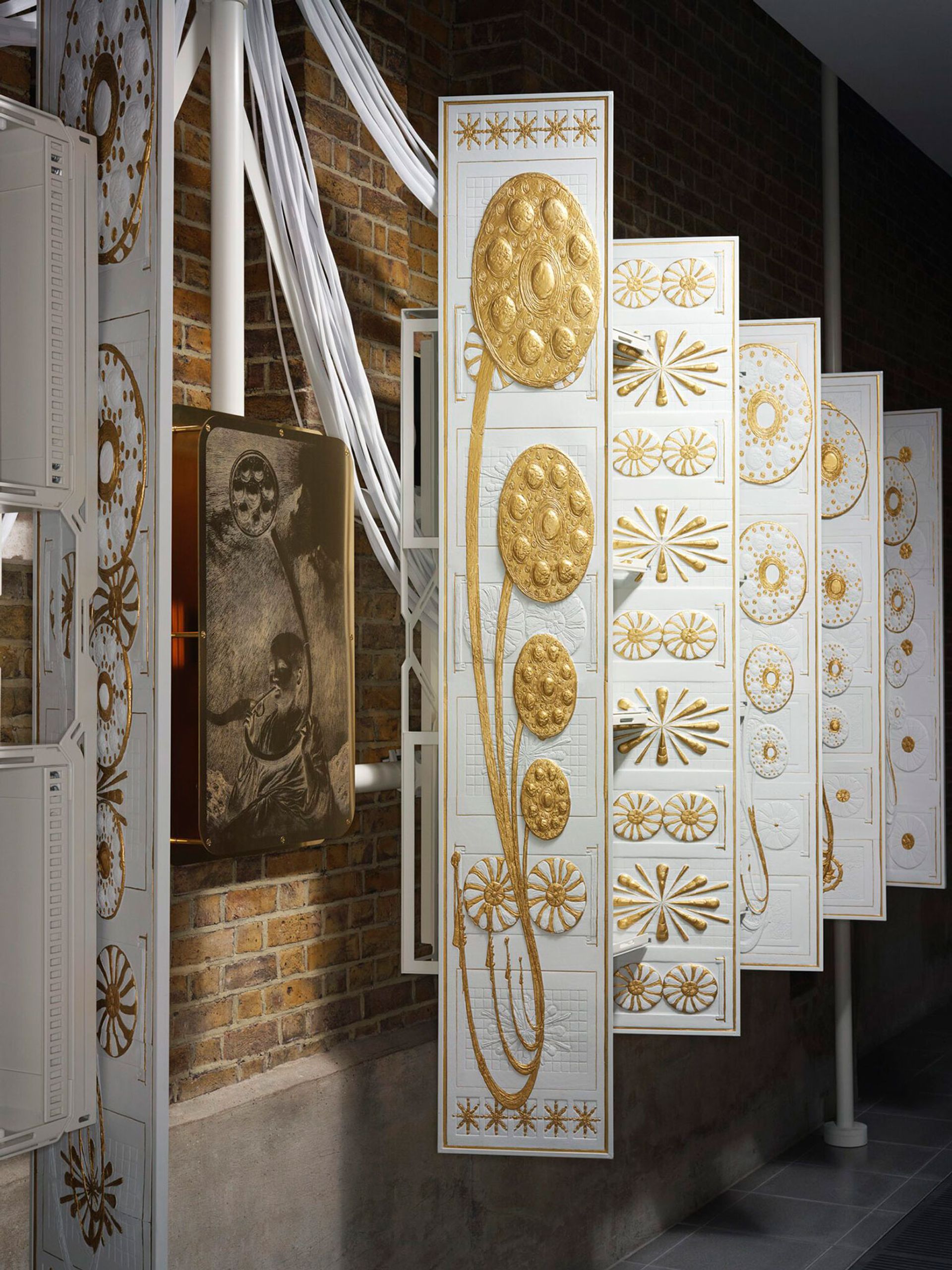 Detail of the Hearth, the organ-like instrument devised by the architectural practice sub for Holly Herndon and Mat Dryhurst's AI choir installation at Serpentine North. The detail on the panels include images of the fictional triffid plant and the GPU computer cooling-fans that populate the Hearth © Leon Chew. Courtesy of Serpentine