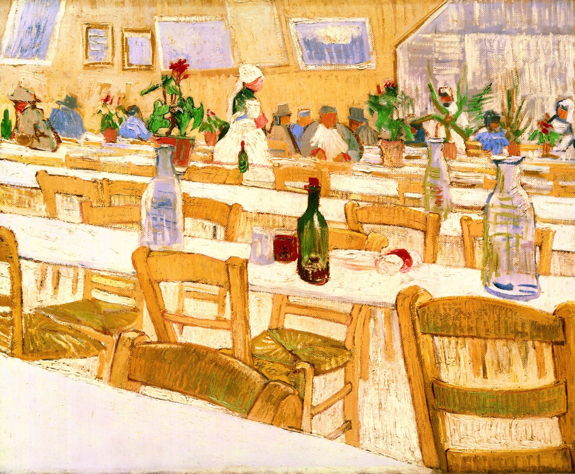Whoever added the sunflowers had obviously associated them with Van Gogh—and their presence on the restaurant tables must have made the picture superficially more attractive to potential buyers. When the copy was made, in the 1950s, it was wrongly thought that the original dated from the summer of 1888, but much later research showed that it was done in the very late autumn of 1887.