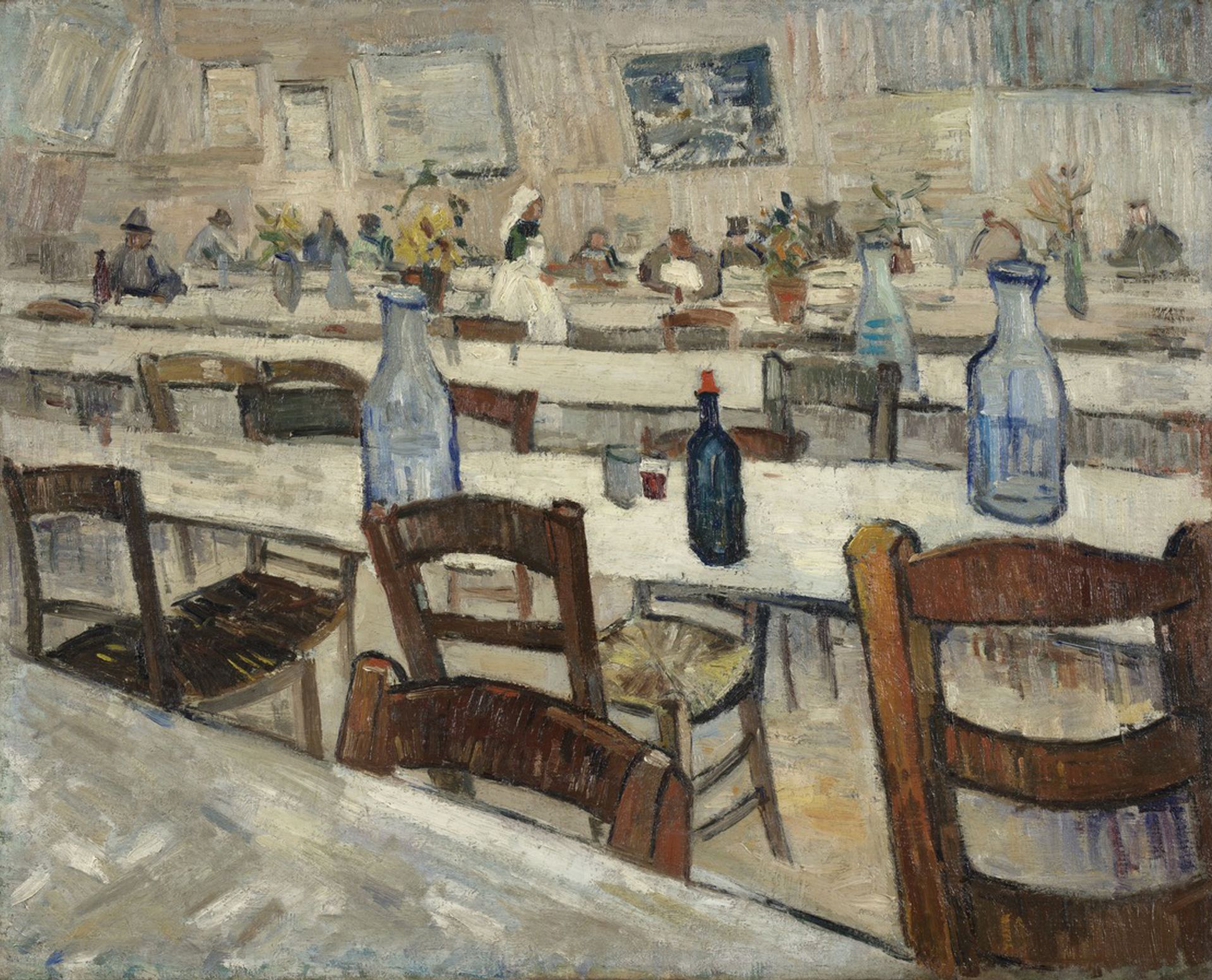 For decades Interior of a Restaurant was regarded as a second version of an authentic painting, Interior of the Grand Bouillon-Restaurant le Chalet, Paris (private collection, November-December 1887). This was understandable, since Van Gogh would sometimes make another version of a composition, either for a gift or to achieve a slightly different artistic effect.