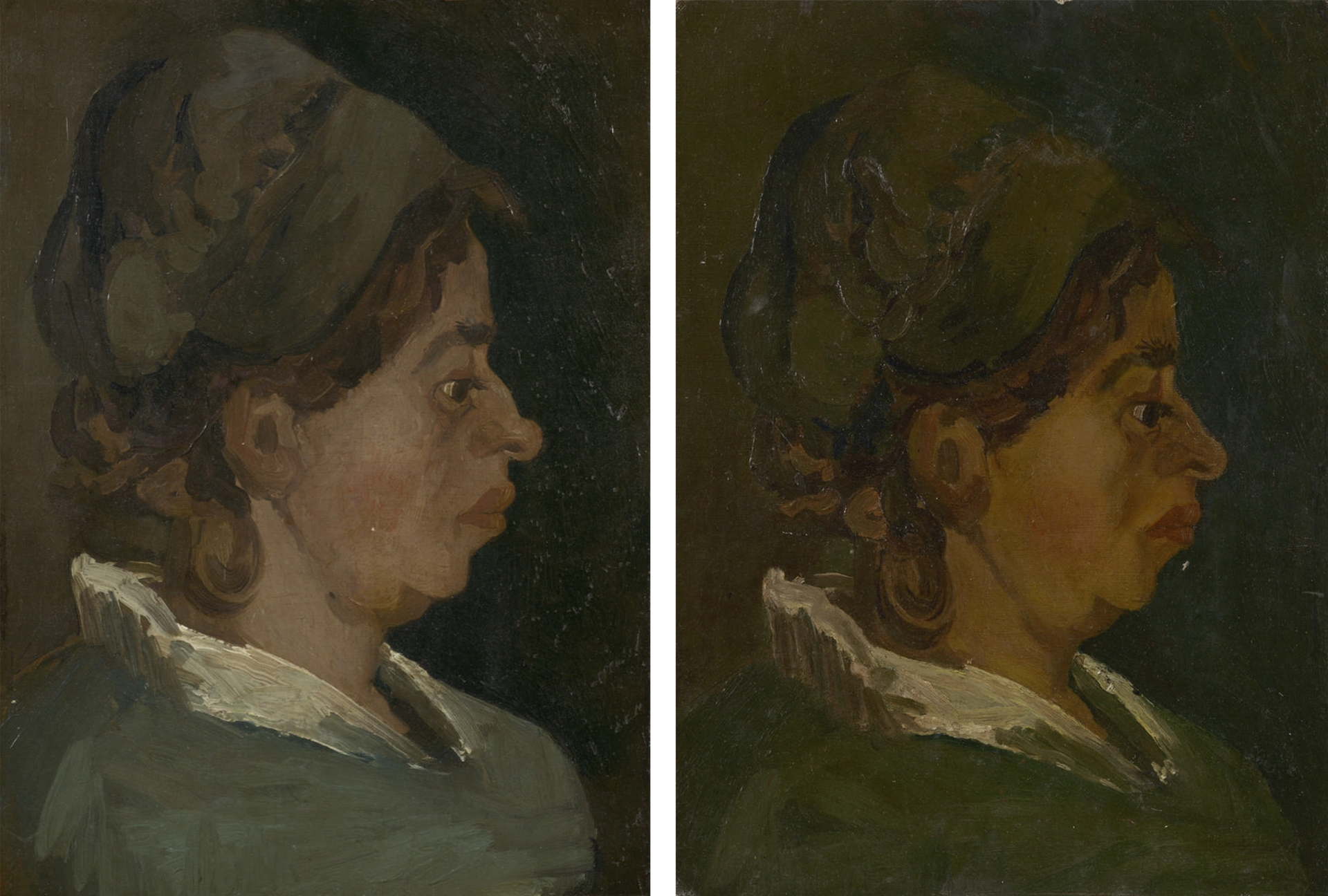 AUTHENTIC (left): Van Gogh’s Head of a Woman with a green Bonnet (late 1884-early 1885), private collection
