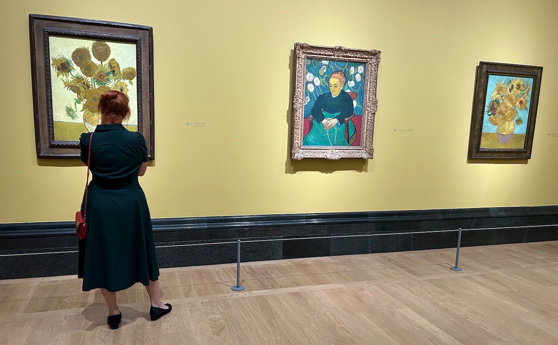 The National Gallery’s Sunflowers on a yellow background (left) and the Philadelphia Museum of Art’s Sunflowers on a turquoise background (right), photographed this week after the protest attack