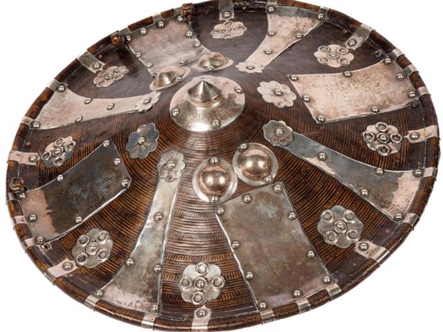 The Battle of Maqdala, the last struggle in the British Expedition to Abyssinia, led to significant looting by the victorious British forces, who took Emperor Tewodros II’s crown along with ceremonial crosses, chalices, weapons and the holy icon Kwer’ata Re’esu. Many of these objects remain in museums in the UK, although several of them have been repatriated in recent years. The leather-and-silver shield is engraved with "Magdala 13th April 1868”, marking the date of the battle during which it was looted.
