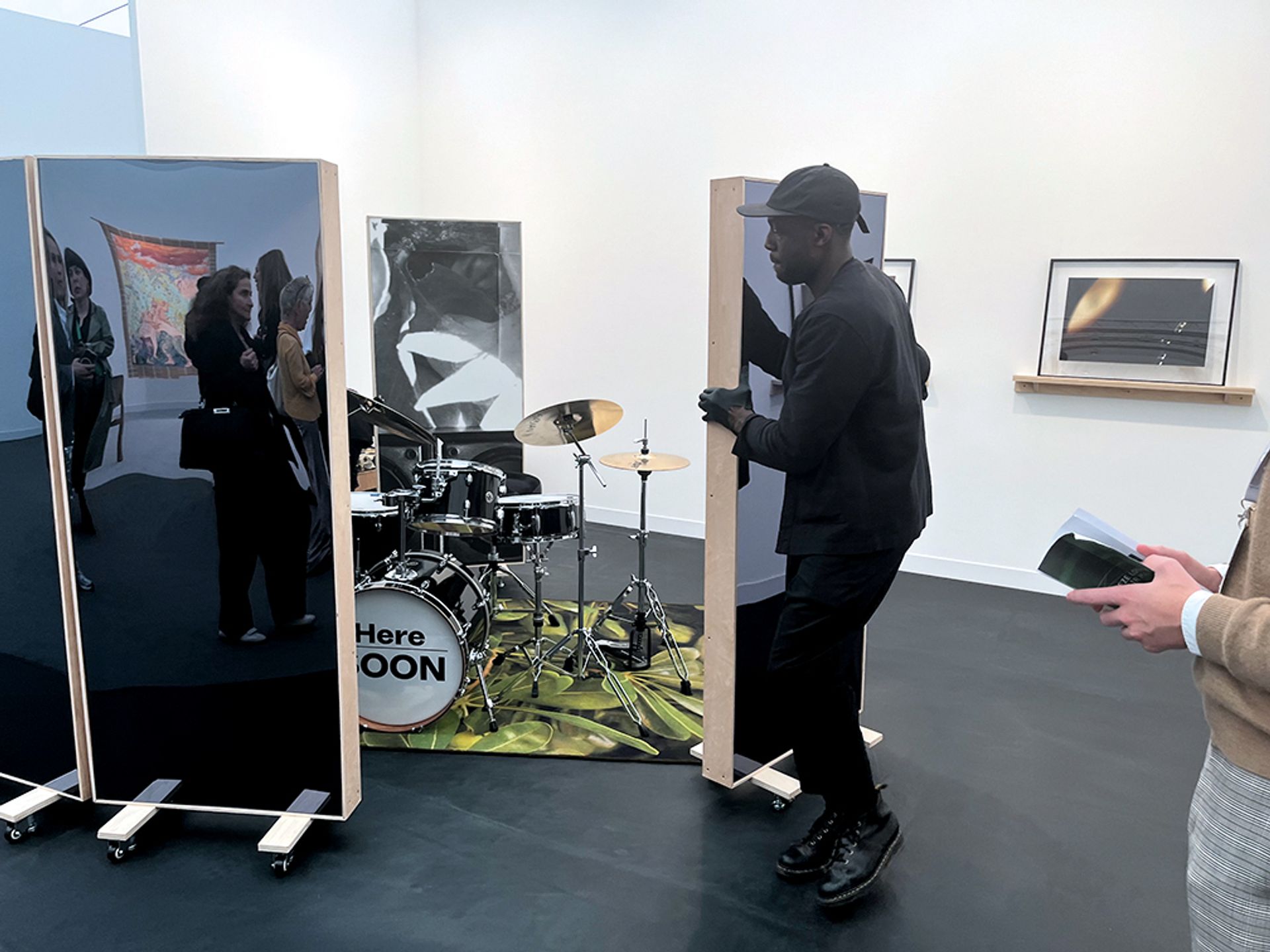 Glenn Ligon, who has selected Appau Junior Boakye-Yiadom for Frieze’s Artist-to-Artist section, describes his protégé’s work as a “call and response with the viewer”. And he’s not wrong. Boakye-Yiadom’s installation of a drum kit bearing the enticing sign “Here Soon” pushes audience anticipation to the max. Partial relief is at hand when every day at 3pm the artist fulfils his promise by taking to the drums for a 35-minute performance. However, the catch is that he almost completely conceals himself behind a series of mirrored screens, playing with the idea of the artist as a source of spectacle and entertainment. The only way it is possible to catch a glimpse of the source of this syncopated sound is by nosily poking your head around the back of his carefully assembled barricade.