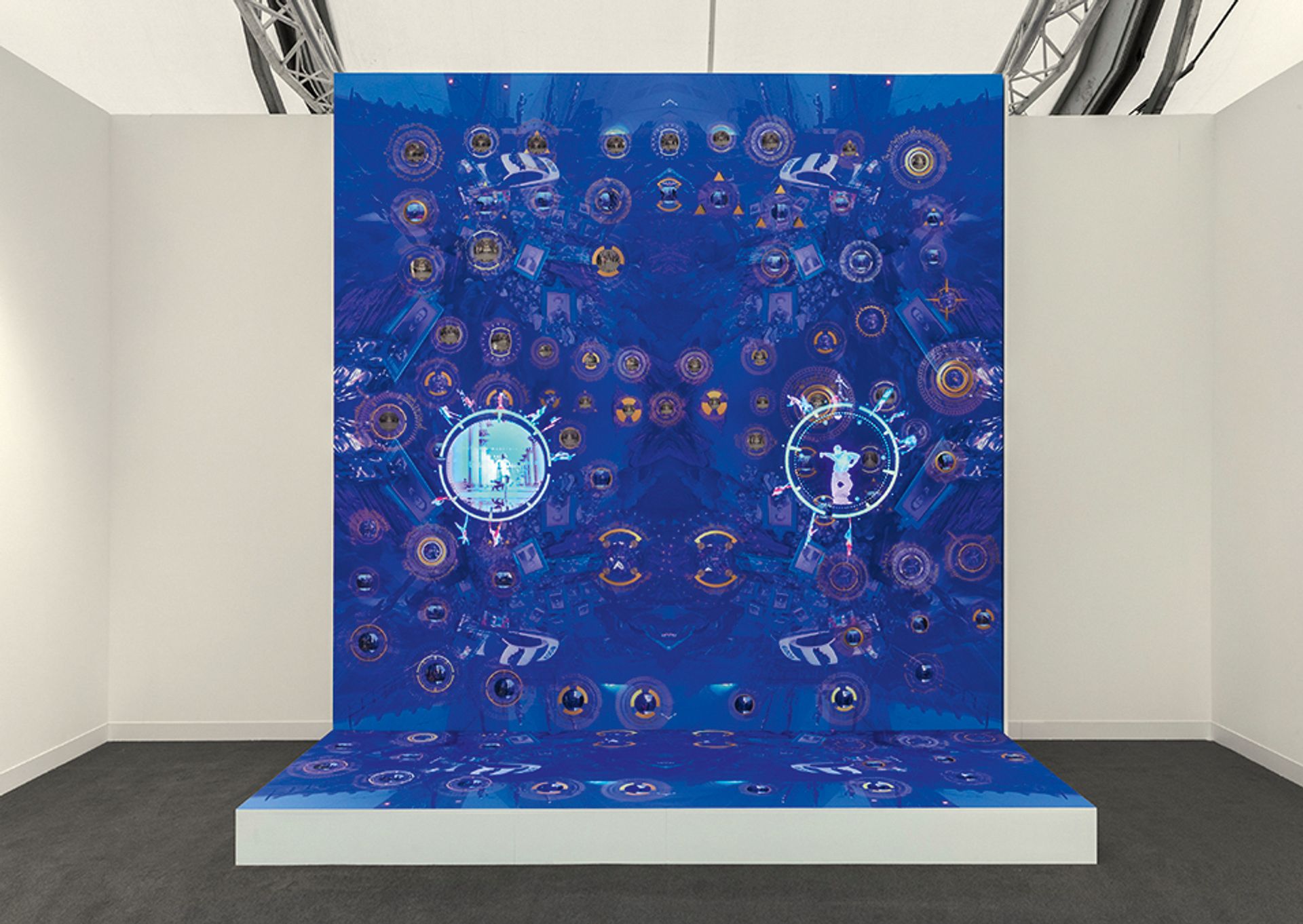 The diaphanous circular animated holograms in Jacolby Satterwhite’s New World Order (2023-24) bring a showstopping allure to the stand of the Düsseldorf gallery Kadel Willborn. Adding to the experience is the pulsing, joy-filled, soundtrack. The work is a development of A Metta Prayer, the artist’s 2023 multimedia commission for the Metropolitan Museum in New York, which was inspired by the Metta prayer, an ancient Buddhist mantra that extols loving kindness.