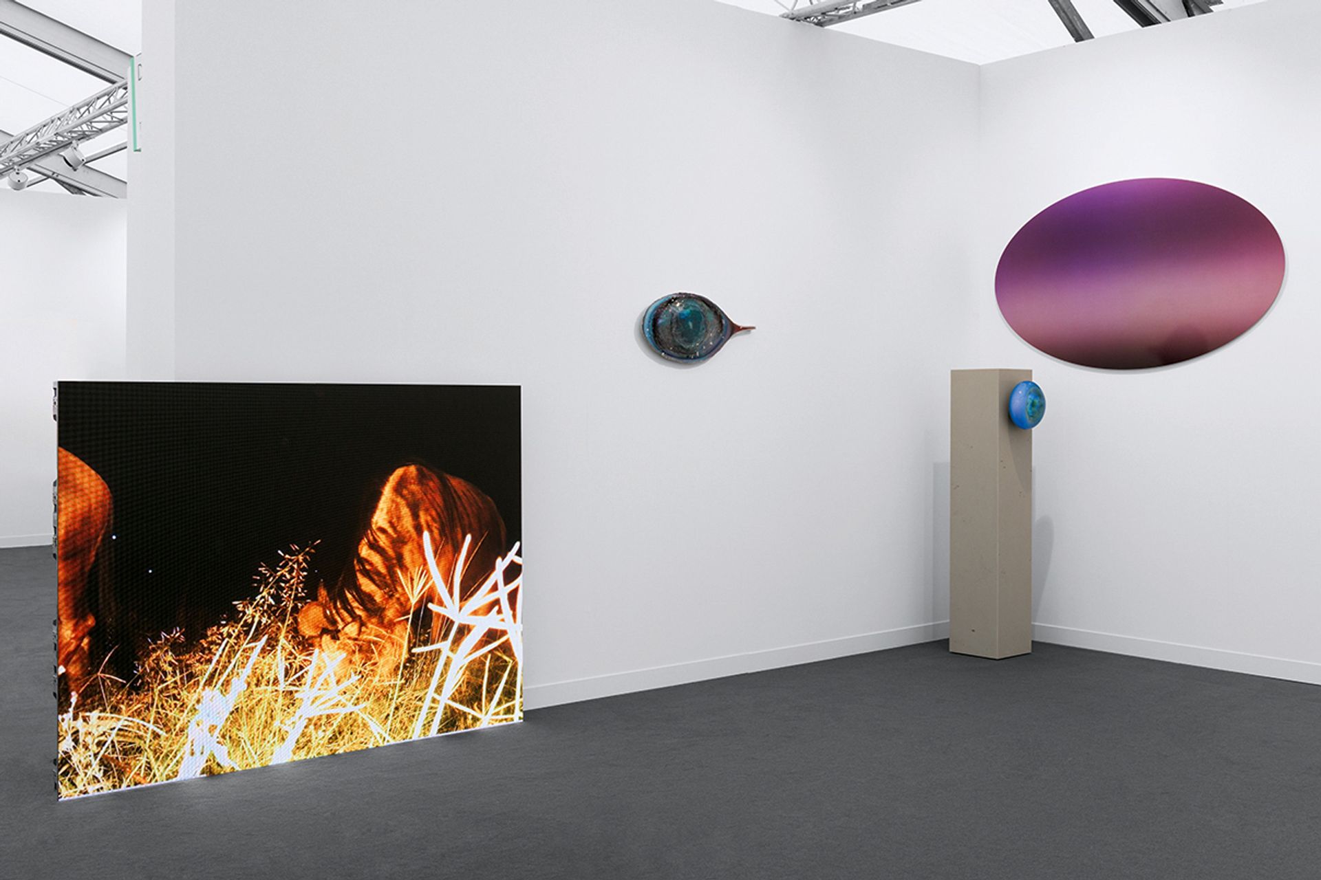 Katja Novitskova, Pattern of Activation (Gardens of the Galaxy) (2023), left, at Temnikova & Kasela. The two works to the right are by the Finnish artist Jenna Sutela Julian Blum