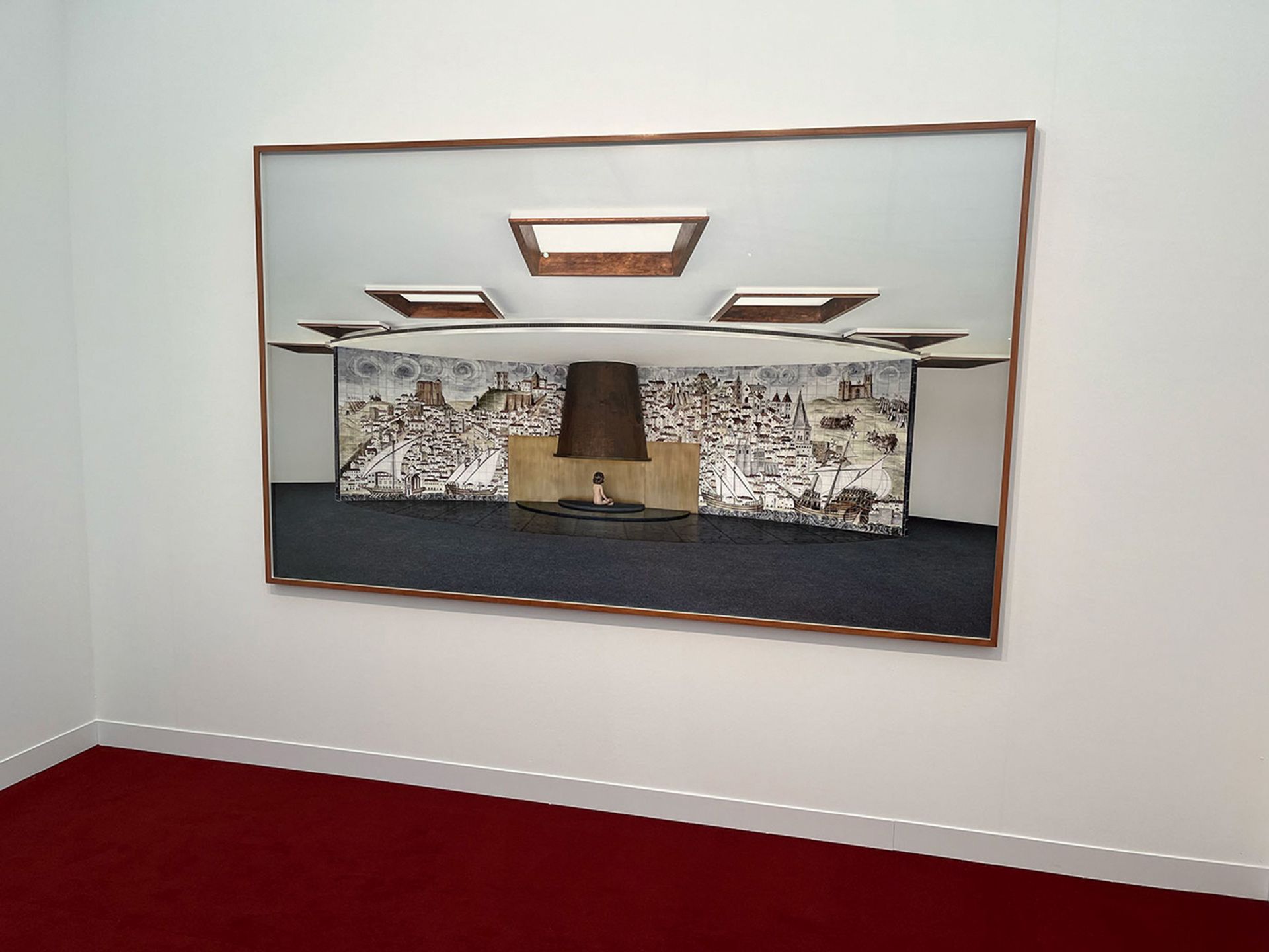 The young Portuguese artist Jaime Welsh’s painterly reworkings, using imaging software, of his own large-format photographs—stylised, consciously unnerving, sparsely inhabited, interiors—draw the eye to the stand of the Lisbon gallery Madragoa. His installation focuses on images taken in the old Banco Nacional Ultramarino in the Portuguese capital, built in the 1950s at the height of the country’s Estado Novo Fascist regime. The former banking headquarters was recently restored as the home of Lisbon’s new Museu Design (Mude), and Welsh’s work confronts whether such a building, however remodelled, can ever be rid of the associations with the deliberately imposing aesthetic of Portuguese authoritarian architecture.