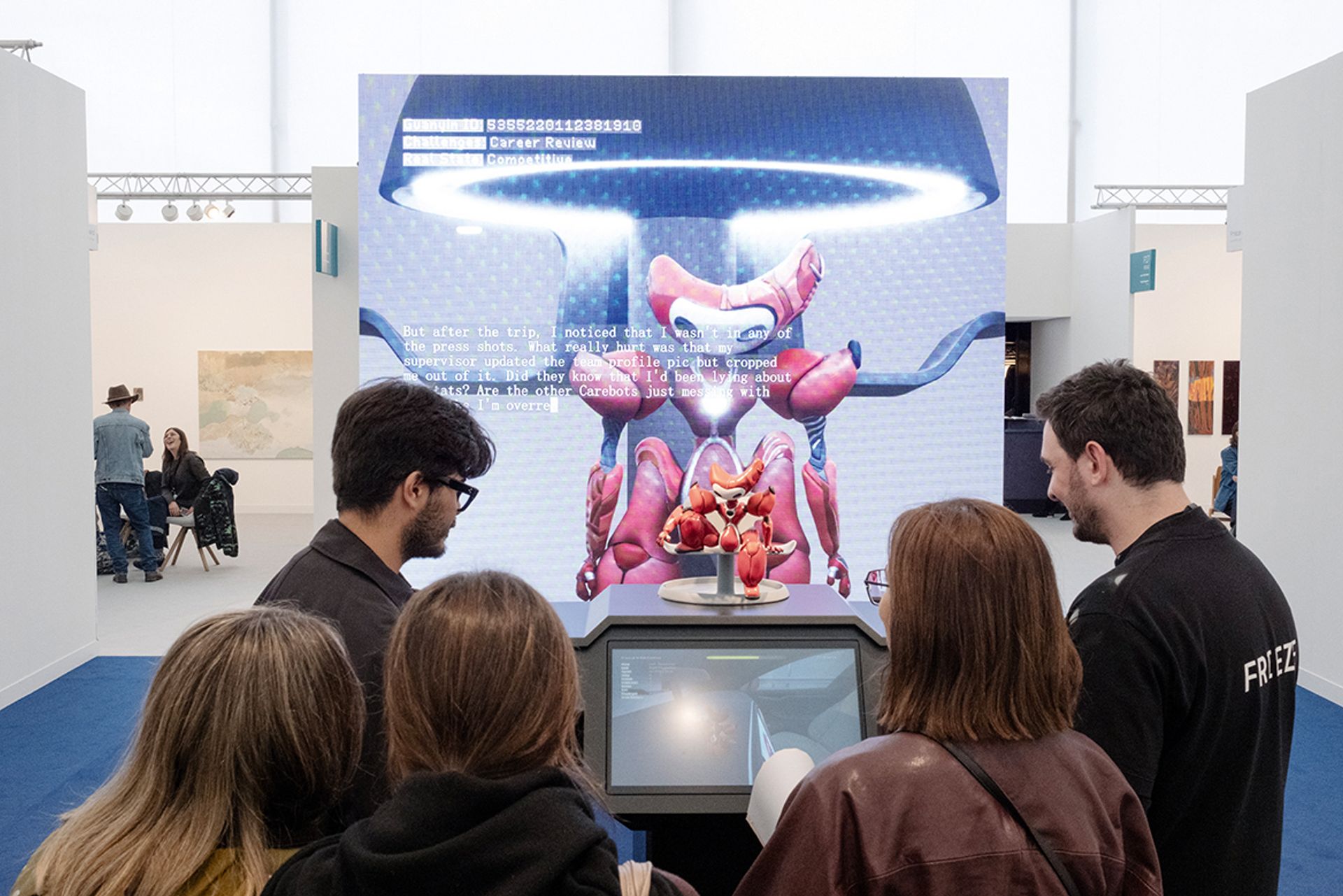 Lawrence Lek, the winner of this year’s Frieze Artist Award commission, is showing an absorbing sculpture and video game installation, where visitors can either play or watch the game being demonstrated. The game Guanyin: Confessions of a Former Carebot (2024) features Lek’s music and poetically measured text narrative. The titular AI robot assumes many of the challenges and frustrations of a human’s working life as it cares for self-driving cars. The London-based Lek has been creating for the gaming environment for more than ten years. Speaking about how fair attendees can engage with Guanyin, he says that “the audience for watching people play video games is as large as that of people who want to play the games. So it becomes as much a performance piece, or a public art piece.”