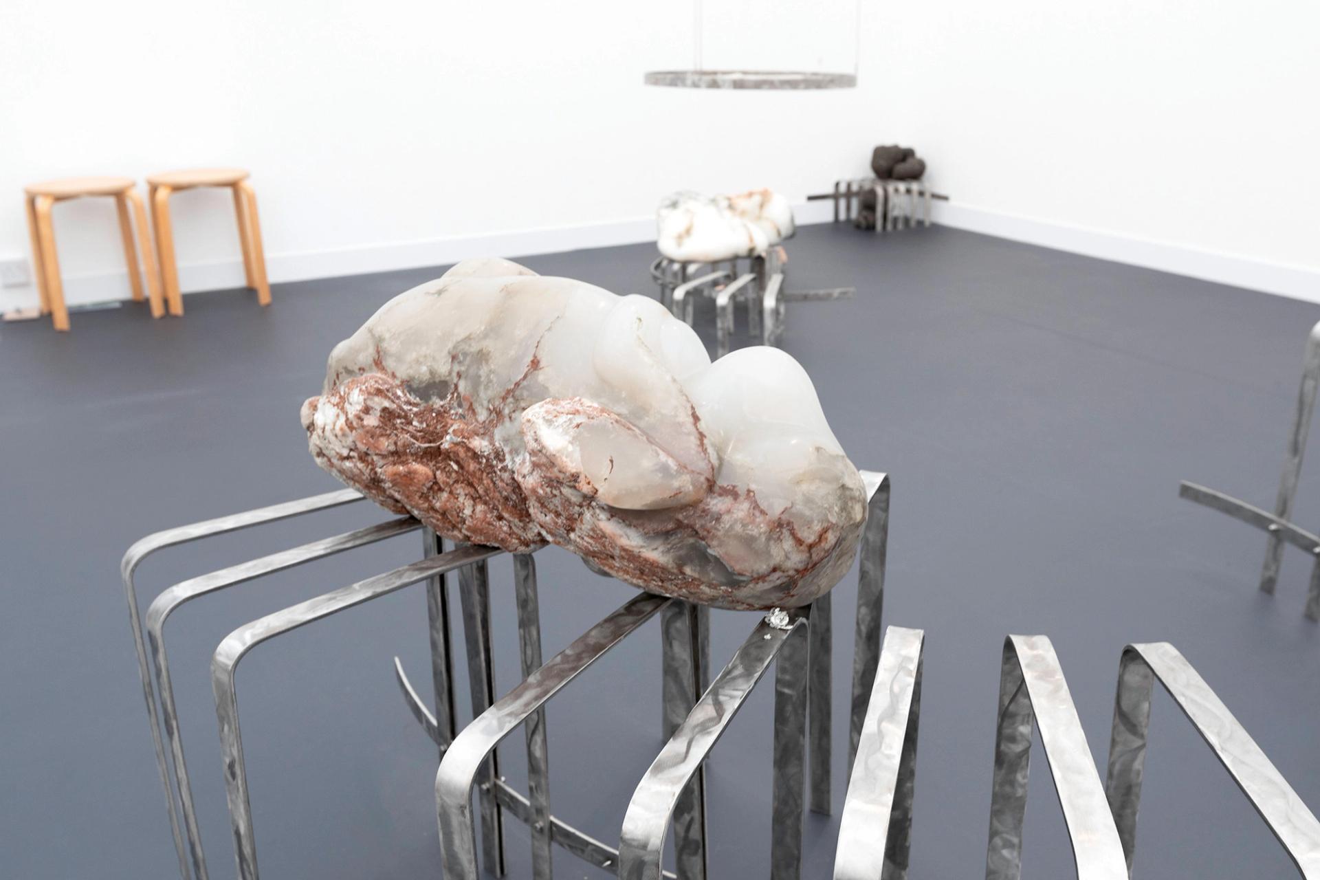 Morgan’s poetic alabaster Animula sculptures hint at bodies and the microbes within them, while emphasising the stone’s distinctive materiality. Deliberately choosing alabaster rejected by conventional sculptors because of its imperfections, Morgan makes forms that wear the dirtier seams of the stone almost like scars. Sitting in and around handworked steel structures burnished with delicate marks so that they resemble drawings, they appear caught between states, partly informed by the post-humanist writings of Rosi Braidotti and Donna Haraway. The series draws on research into the Moray Firth caves in Scotland and the cartography of mines; hanging sculptures feature flat alabaster forms resembling models of landscapes, with apertures evoking holes in the land.