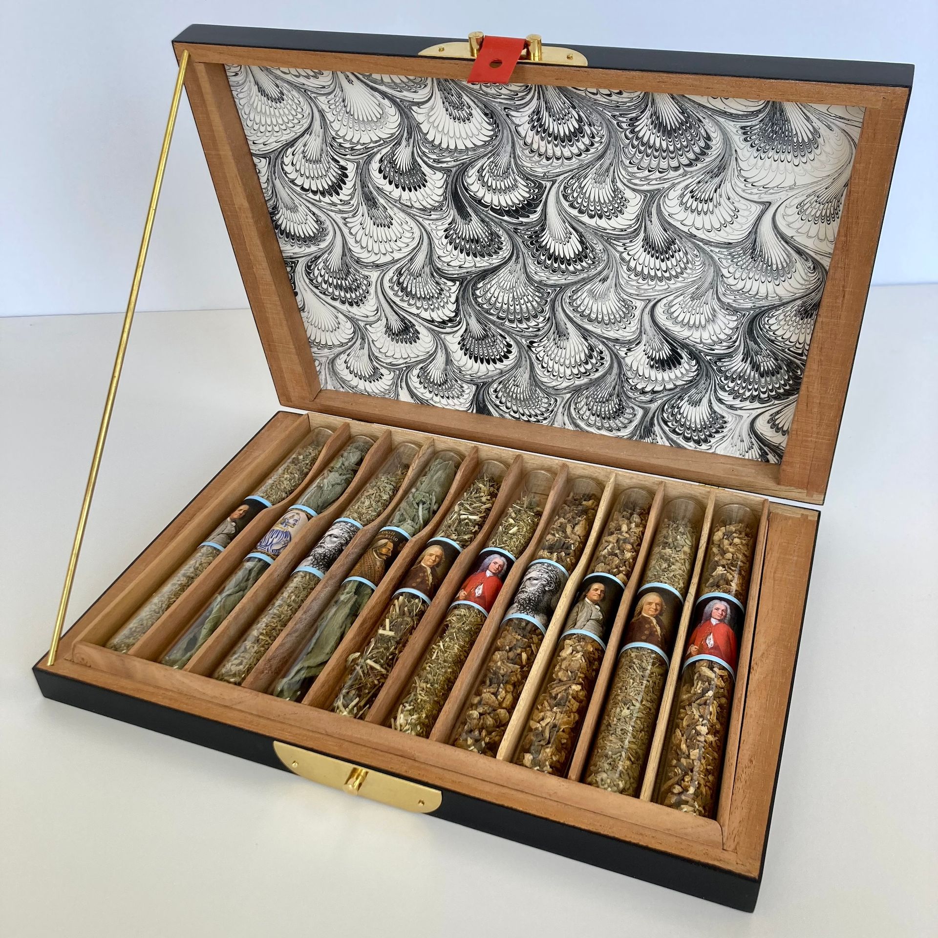 Also included in the exhibition is Dallas-based artist Cynthia Mulcahy’s Daddy (War Garden Series) (2024), a lacquer box containing ten glass tubes that resemble cigars. Each tube has an image of a famous man, such as Benjamin Franklin and Pope John XXI (1215-77), all of whom published guidelines on how to prevent or terminate pregnancy with plants, examples of which fill the glass vessels.