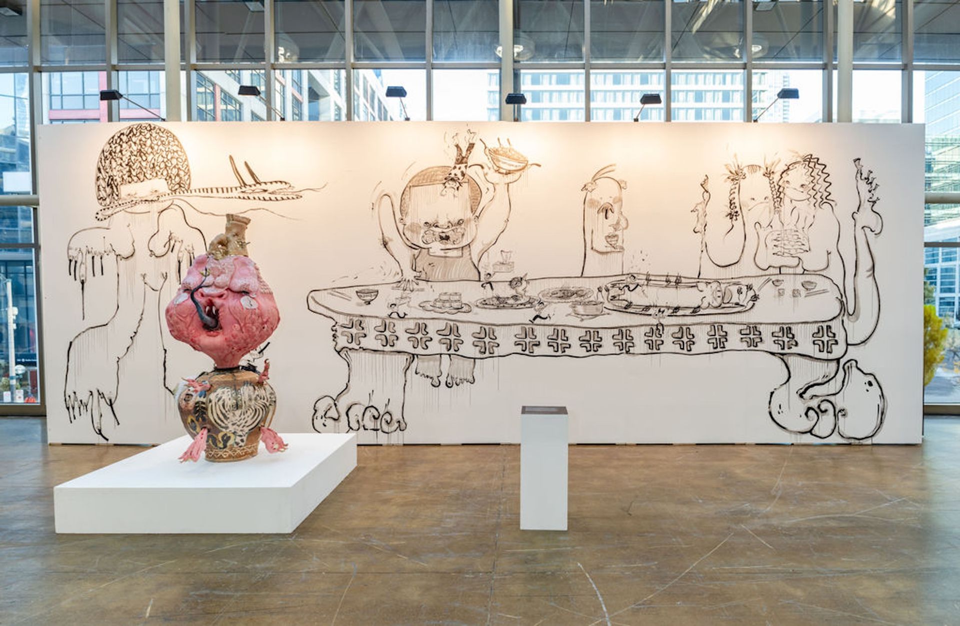 Visitors are greeted at the top of the escalators by an installation by the Toronto-based Chinese artist Sami Tsang (presented by the local gallery Cooper Cole)—a phantasmagorical piece that resembles a giant monster baby emerging from traditional pottery—and an accompanying large-scale painting depicting the same.