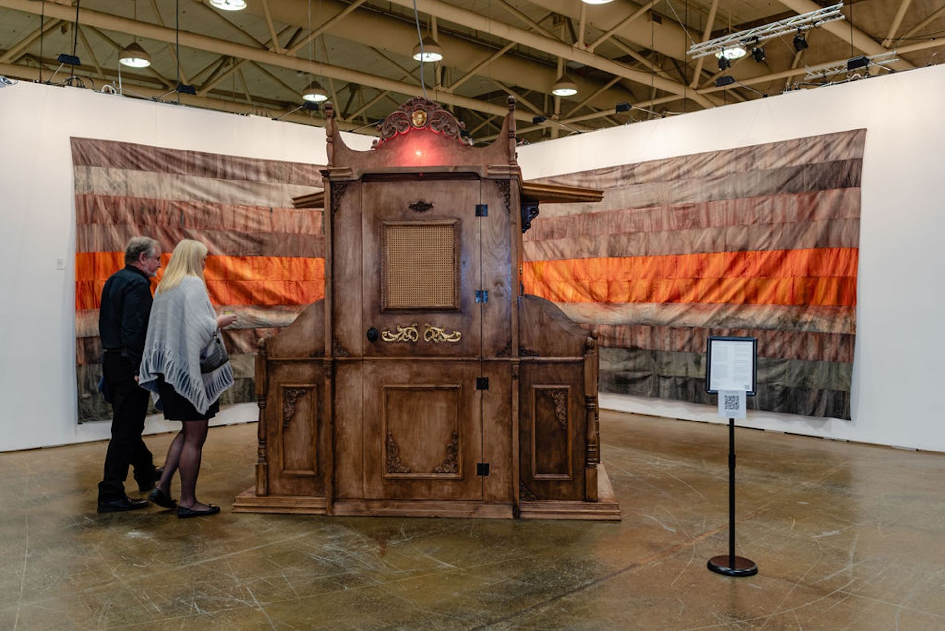 Visitors at Art Toronto examine Eddy Firmin's The Confessional (2024), presented by Art Mûr Courtesy Art Toronto