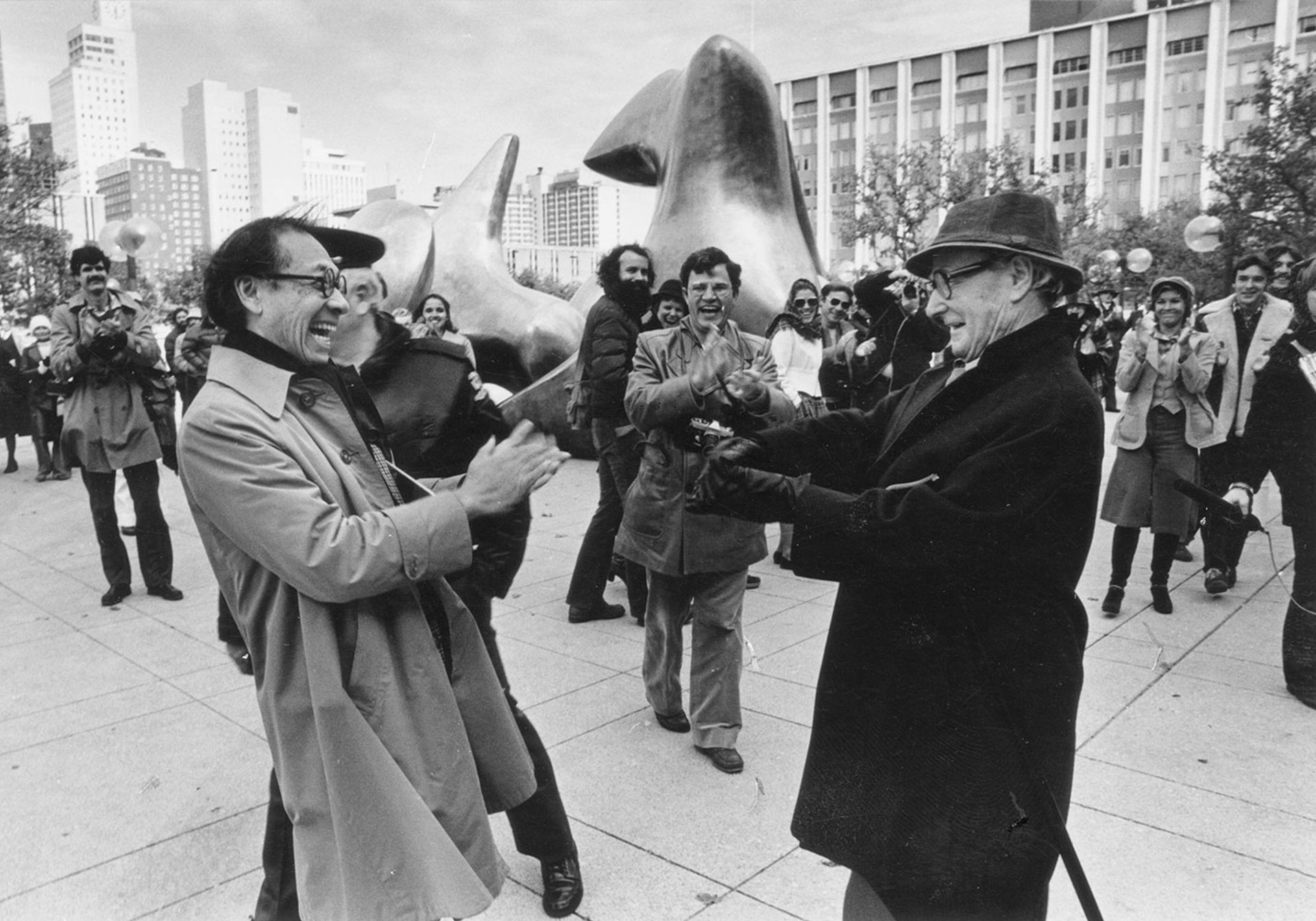 The architect I.M. Pei (left) and Henry Moore applaud each other at the inauguration of Moore's Three Forms: Vertebrae, Dallas, May 1978. The sculpture stands in front of Pei's Dallas City Hall (out of picture left), which was completed in the same year