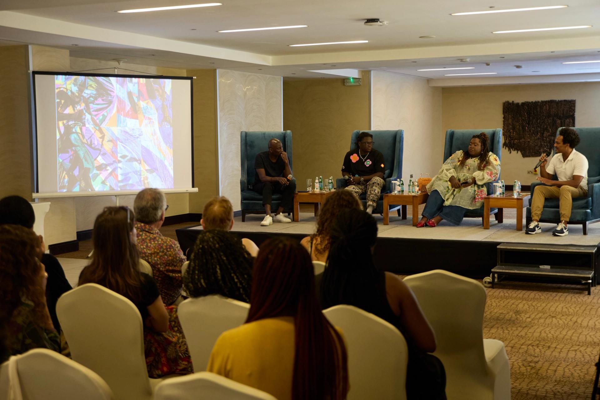 An Accra Cultural Week artist talk hosted by the curator Ekow Eshun (further left on stage). On the panel (left to right beside Eshun) are the artists Julianknxx, Michaela Yearwood-Dan and Che Lovelace