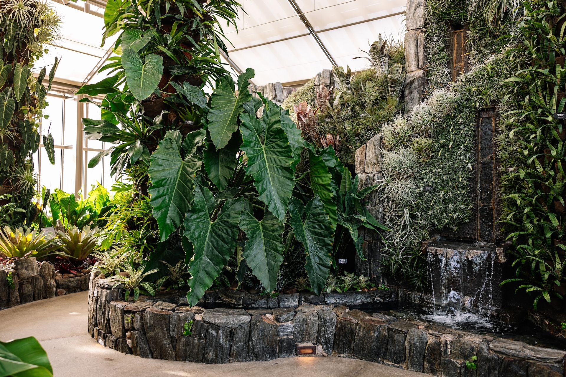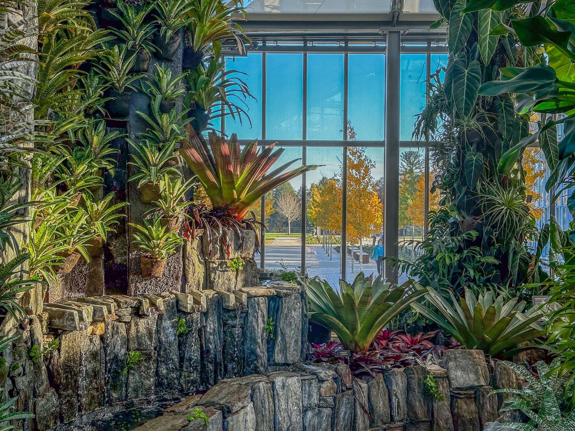 The gardens’ most recent revamp was spearheaded by the architecture firm Weiss/Manfredi in collaboration with the landscape architects Reed Hilderbrand, who worked with the Burle Marx Landscape Design Studio to oversee the transfer of the cascade garden to an enlarged custom glasshouse. The cascade garden comprises 16 waterfalls that flow into a pool, framed with climbing vines and clusters of striking bromeliads. Most of the original plants have been replaced over the years, as some had grown too tall for the glasshouse and were crushed against the ceiling; others were badly burnt due to poor climate control.