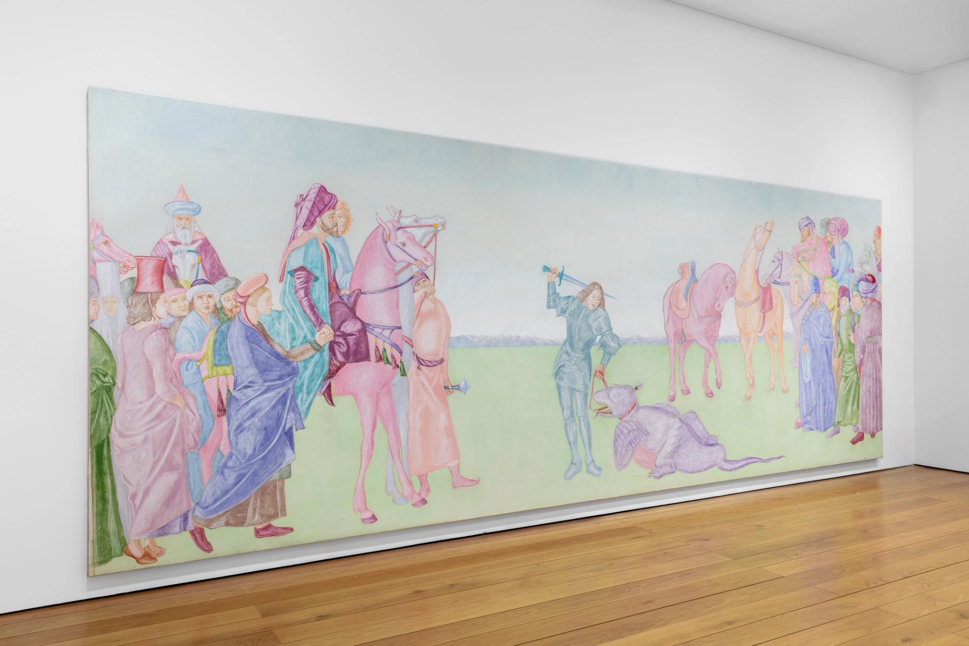 Meanwhile Pinacoteca Agnelli’s main galleries contain the most extensive survey to date of the Italian artist Salvo—aka Salvatore Mangione—who was born in Sicily but relocated to Turin as a child, where lived until his death in 2015. Salvo; Arrivare in tempo [Arriving on time] challenges the commonly held view that in the early 70’s this quixotic provocateur abruptly changed course from making conceptual art to embrace a more conservative painterly figuration. Innstead, it places Salvo’s crisply executed, trippily coloured canvases firmly within the context of his earlier arte povera-influenced investigations. Organised thematically and grouped according to oft-repeated motifs—including factories, streetlamps, moonscapes and his especially incongruous pastel-hued renditions of classic St Georges slaying their dragons—Salvo’s serial repetitions and interrogations of art history are rebooted in a way that seems contemporary.