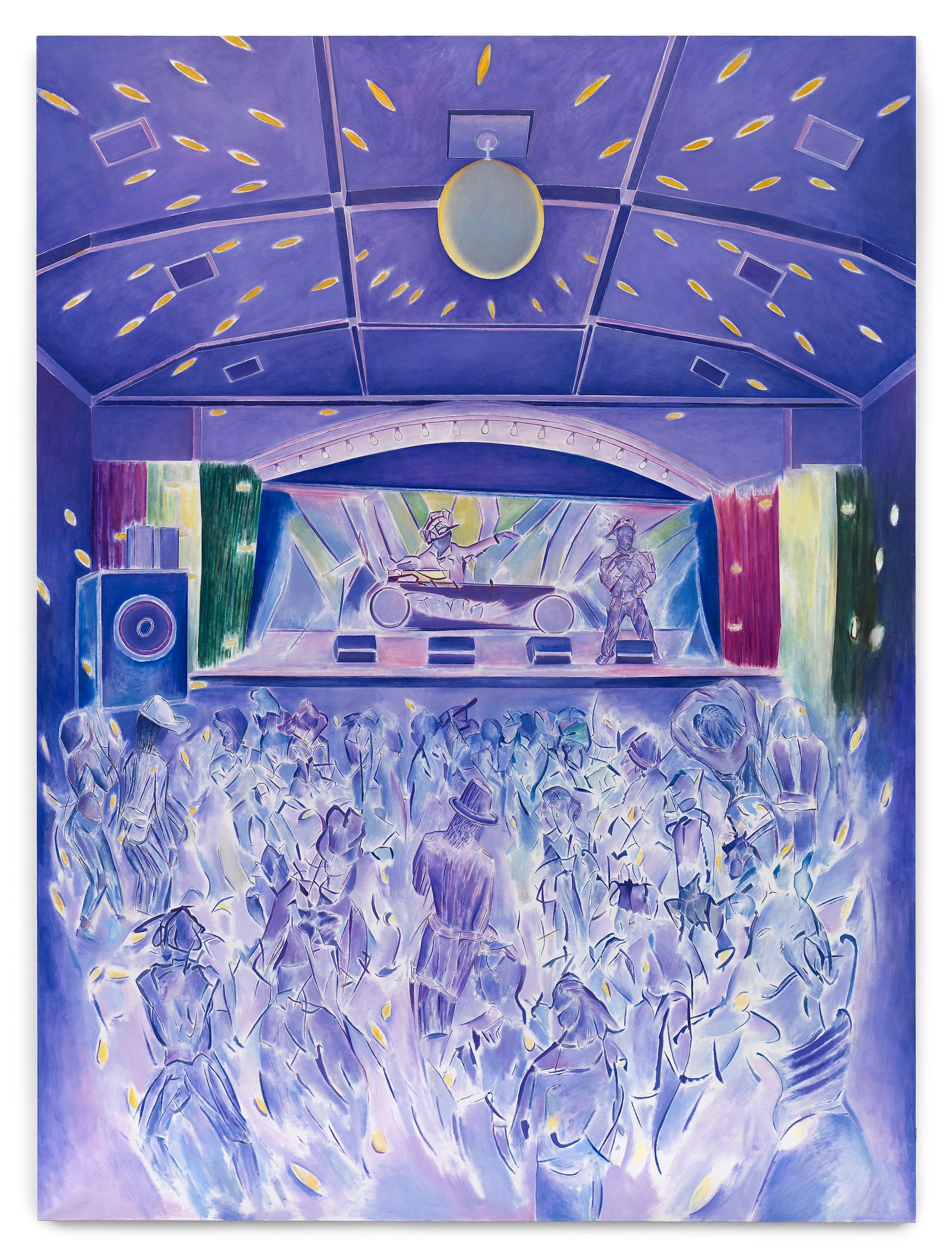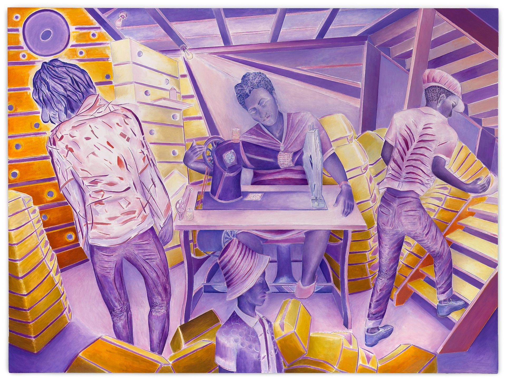 Most of the paintings that Friedman is presenting in Tribeca, with Andrew Kreps Gallery, depict scenes of close community: underground reggae dance clubs that Forrester frequented in London in the 1980s, and snapshot-like views of his siblings at work in their single mother’s home business, making handbags. Sewing machines are a central feature of several paintings at Kreps that fairly vibrate in pink, lavender, orange and blue. At Friedman, the darker nightclub scenes are crowded with commingling figures. Faces are indistinct but it’s clear there’s a party going on.