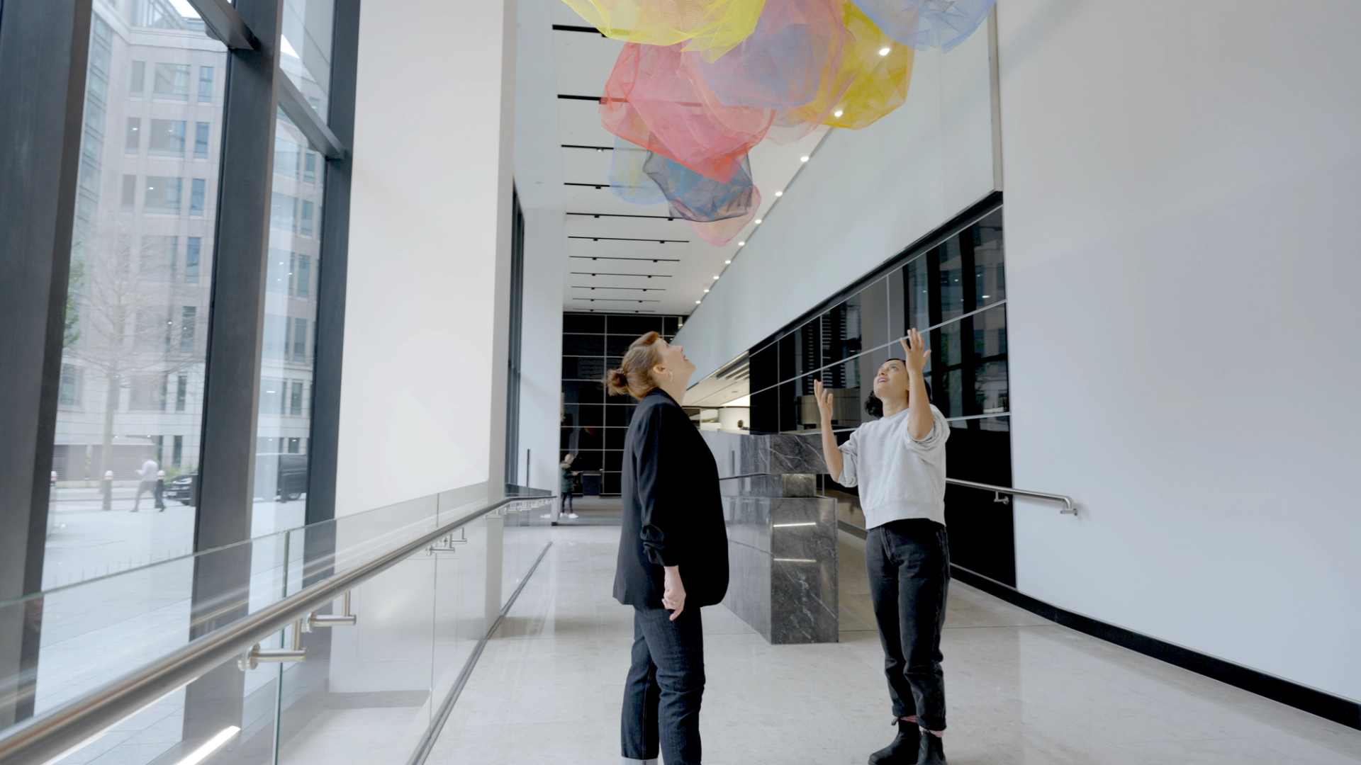 Louise Evans, UBS Art Collection Regional Manager for UK, Northern Europe, the Middle East and Africa, says that Begum’s work adds to UBS’s legacy of commissioning artists for a collection that now comprises over 40,000 objects. At 5 Broadgate there is an element, Physichromie UBS Vert, from an earlier site-specific work by Carlos Cruz-Diez for a former office in Zurich in 1975, as well as the magenta light bulb sculpture Light by Michael Craig-Martin (2018), and Cerith Wyn Evans’s neon More Light Research (2019), also suspended from on high.
