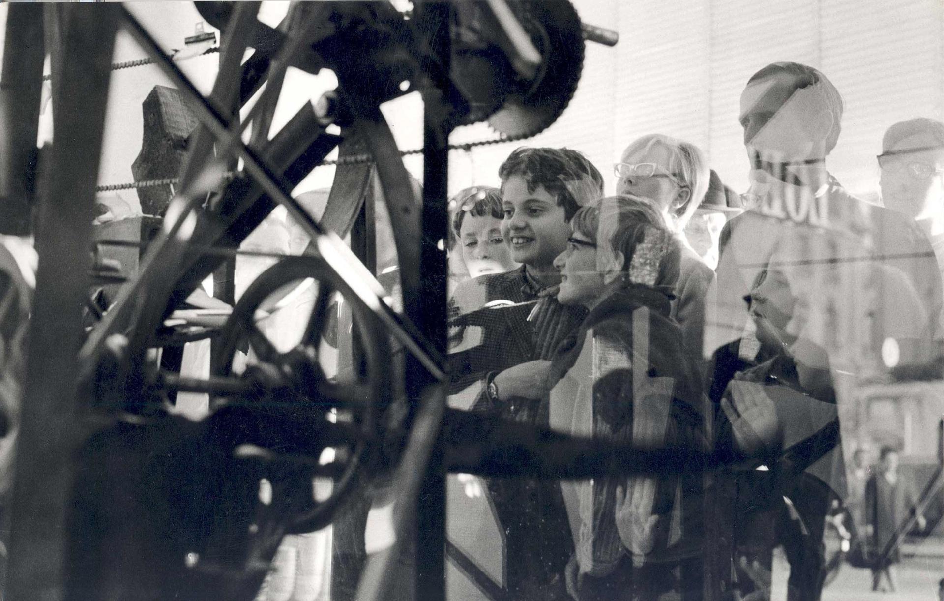 Children looking at Jean Tinguely’s Rotozaza III sculpture in a shop window in Bern in 1969 © Staatsarchiv des Kantons Bern, Museum Tinguely, Photo: Fredo Meyer-Henn