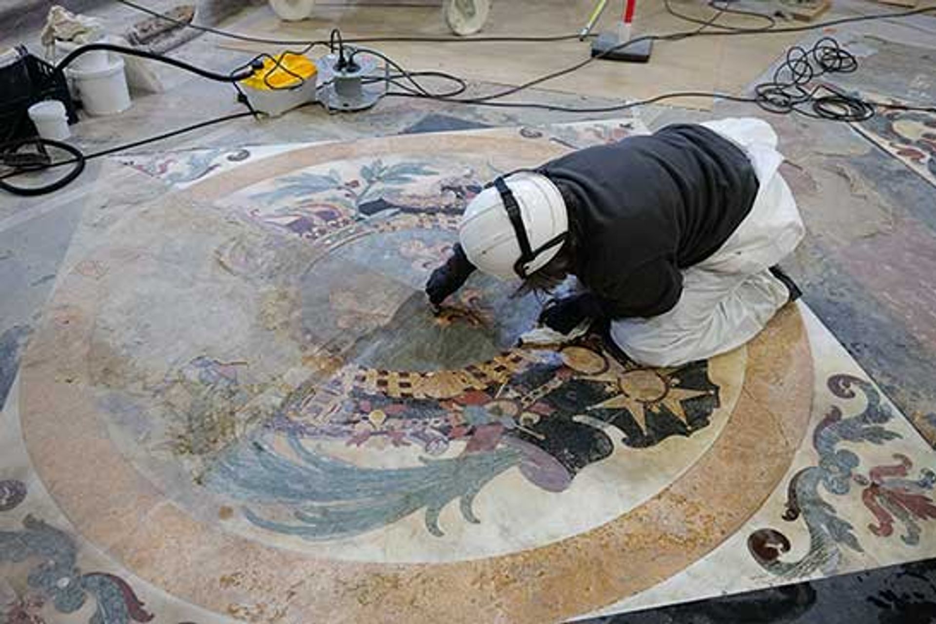 A stone artisan works on the marble marquetry in the centre of the cathedral choir