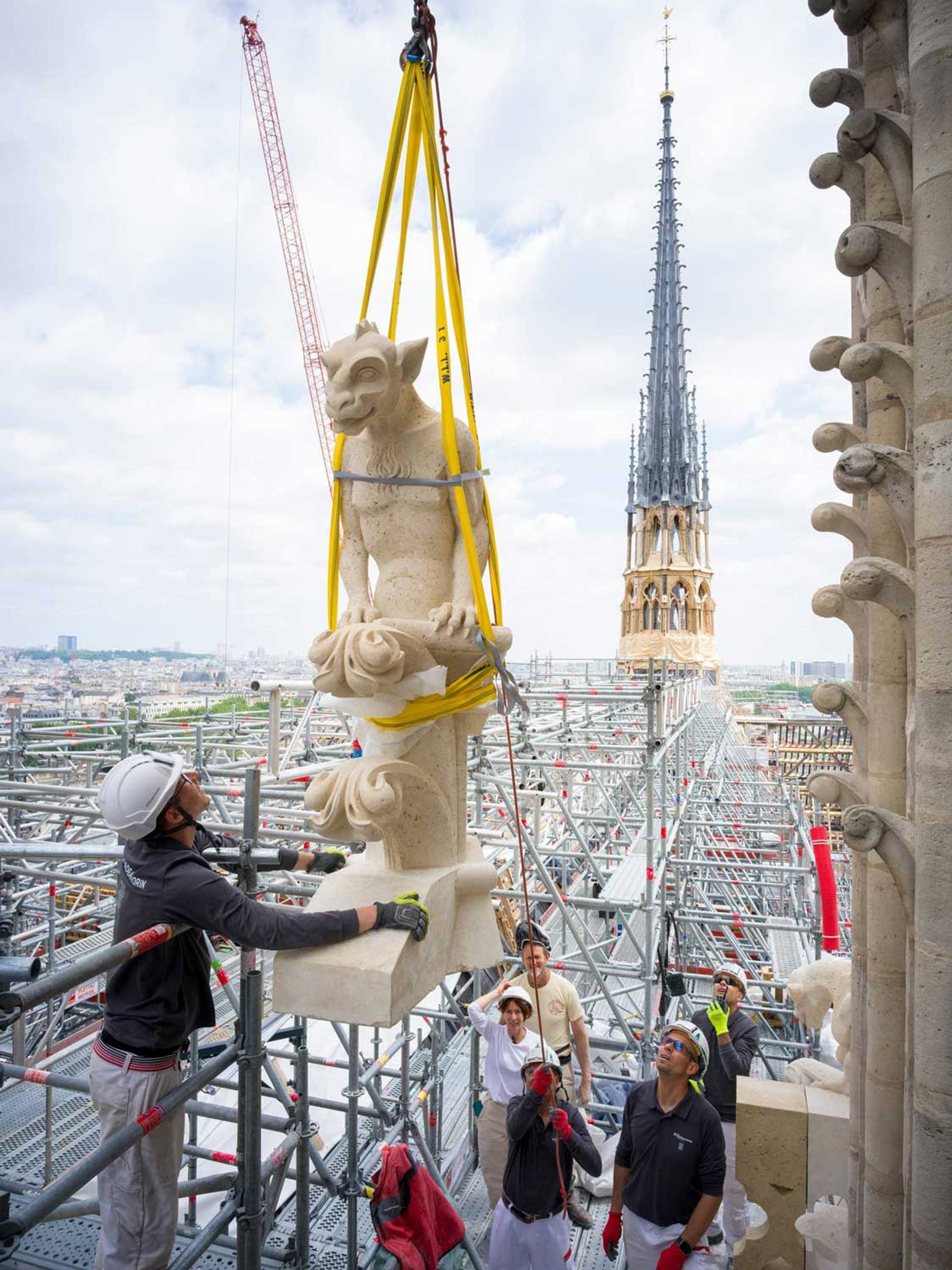 One of the resculpted chimeras is lifted aloft to its position on the rooftop