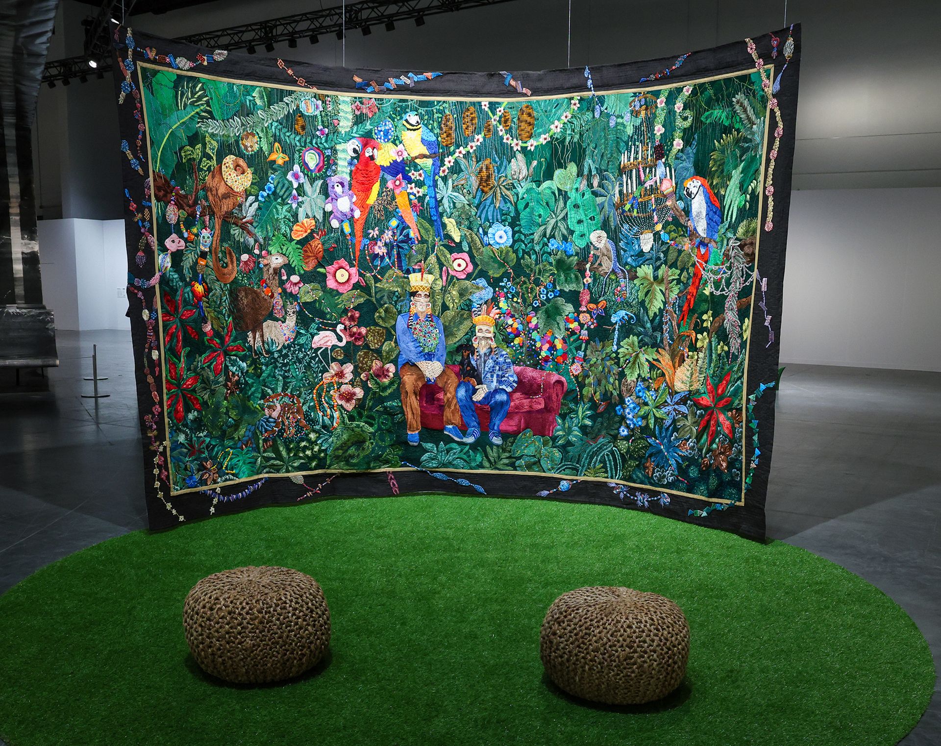 “The two artists are a couple who spent six years making this family portrait with their dog using European tapestry-making techniques. They’re wearing Guaraní headdresses, and there’s a lusciousness and beauty to the scene that’s like paradise, like Eden. There is also an alcove, where you can sit down and look at the work more closely.”