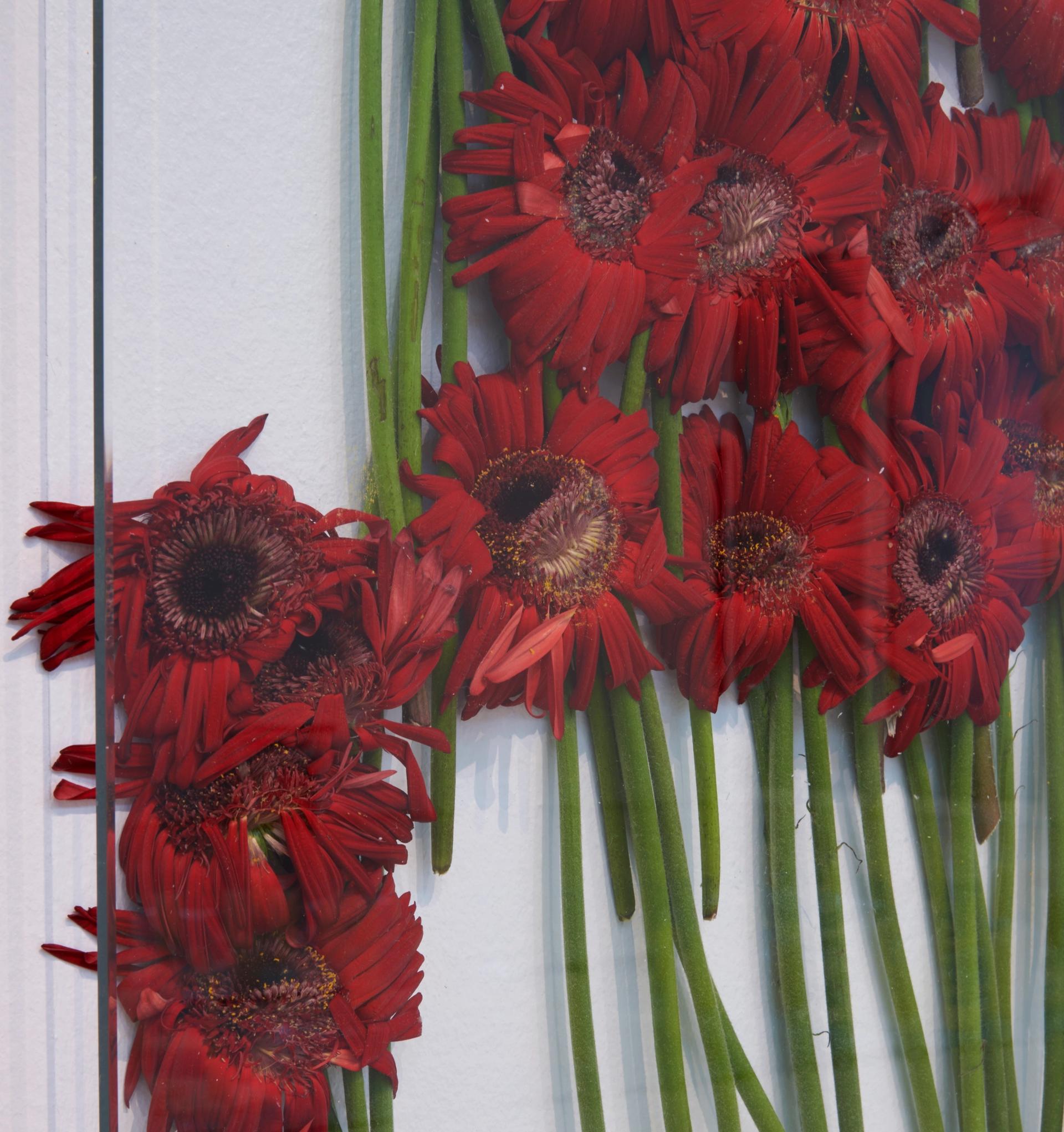Installation view of Anya Gallaccio, Preserve ‘Beauty’ (1991/2024), featuring 1,700 gerbera held between seven panes of glass and a gallery wall