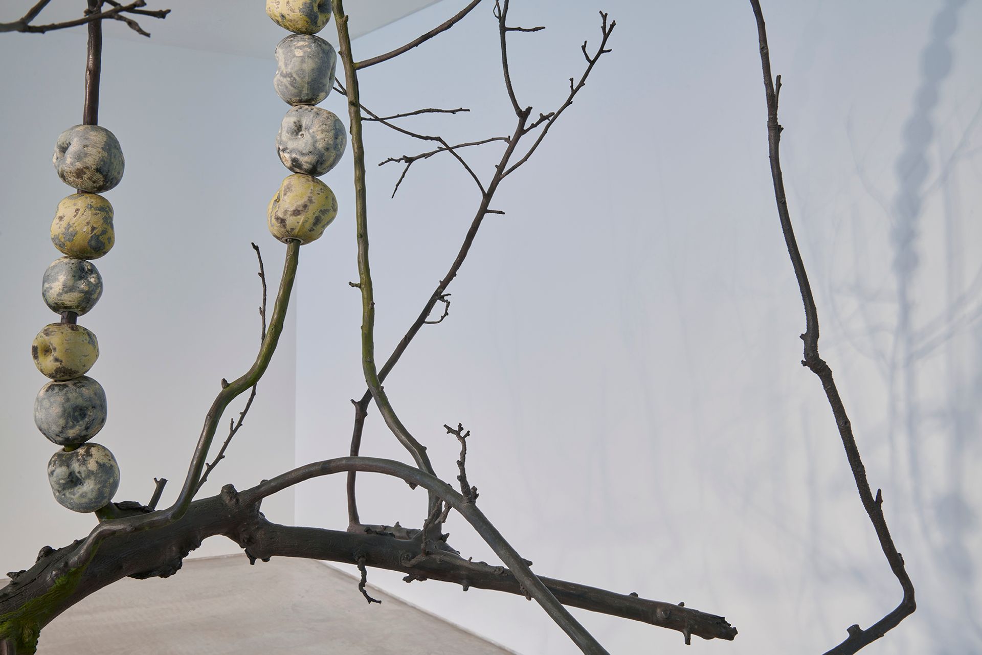 For as both the natural world and Gallaccio’s exhibition repeatedly confirms, out of decay new life emerges. In addition to the very active strains of bacteria and fungus flourishing in her mouldering blooms and apples, life is also unexpectedly bursting forth in another work, The Inner Space Within (2008-24) which centres around the crown of a mature ash tree which had to be felled due to ash dieback disease. From the crown, what initially seemed to be inert woody surfaces now bloom with a covering of vivid green moss, while out of one of its crevices sprouts a jaunty youthful “cuckoo tree” of native elder, which appears to be flourishing courtesy of its felled host. This arboreal corpse should teem with even more life when, after the exhibition, it is returned to its original home on the Lees Court estate near Faversham in Kent, where it will be left to create new habitats for local wildlife.