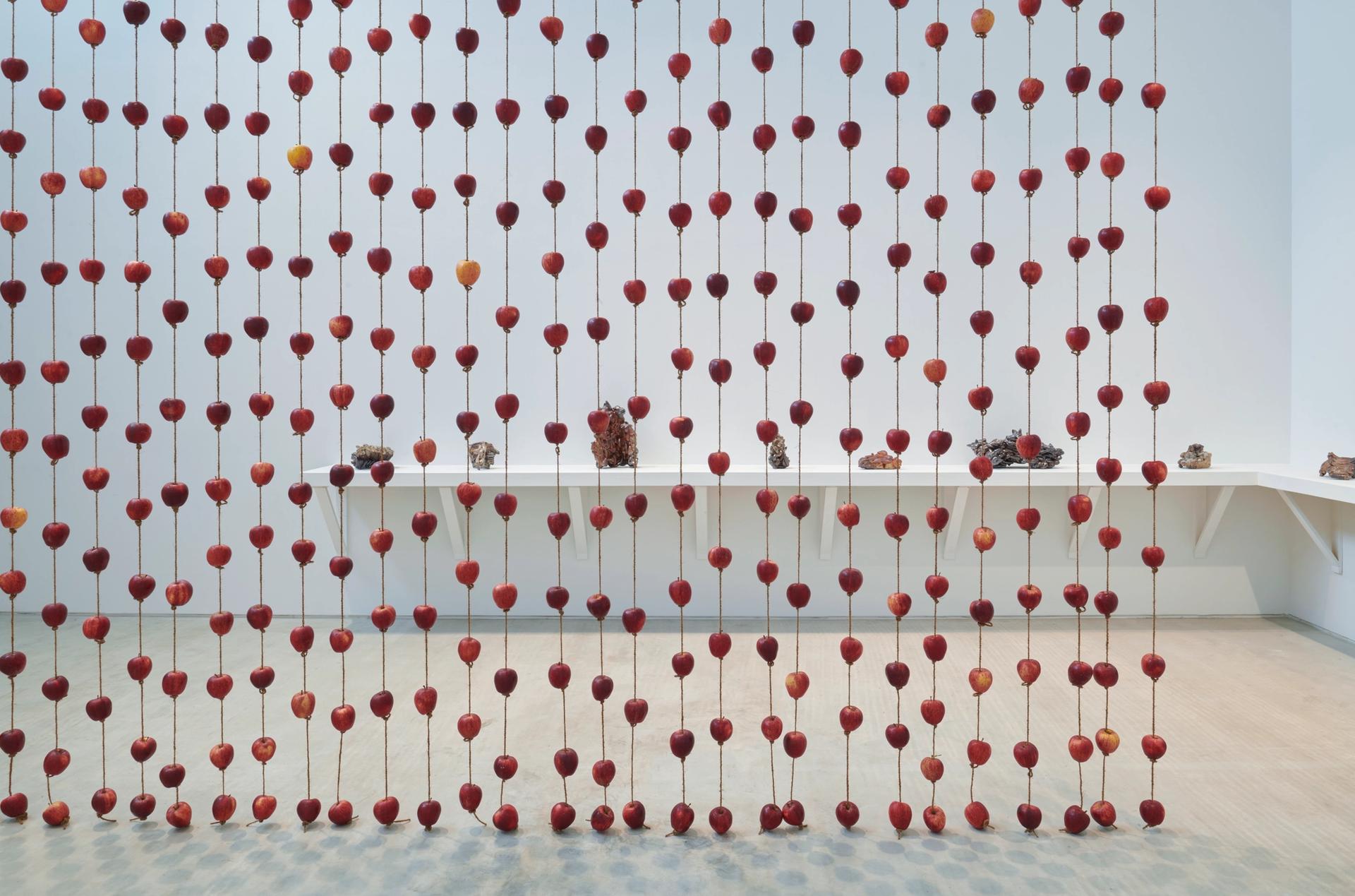 Installaton view of Anya Gallaccio, Falling from grace (2000), featuring 2,700 “gala“ apples threaded on hop twine