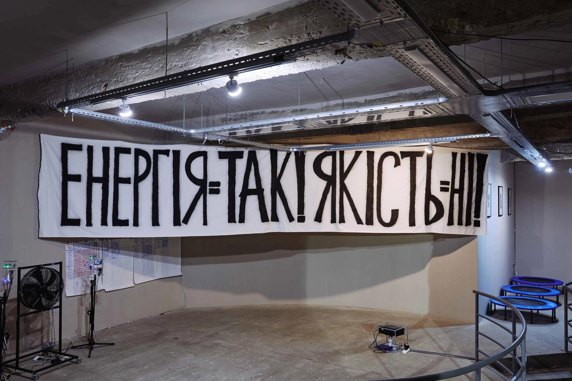 Installation view of Thomas Hirschhorn, Energy=Yes! Quality=No! (2024), a banner marking the culmination of the artist’s series of workshops; and Yulia Kostereva & Yuriy Kruchak All That’s Solid Melts into Air (2024)
