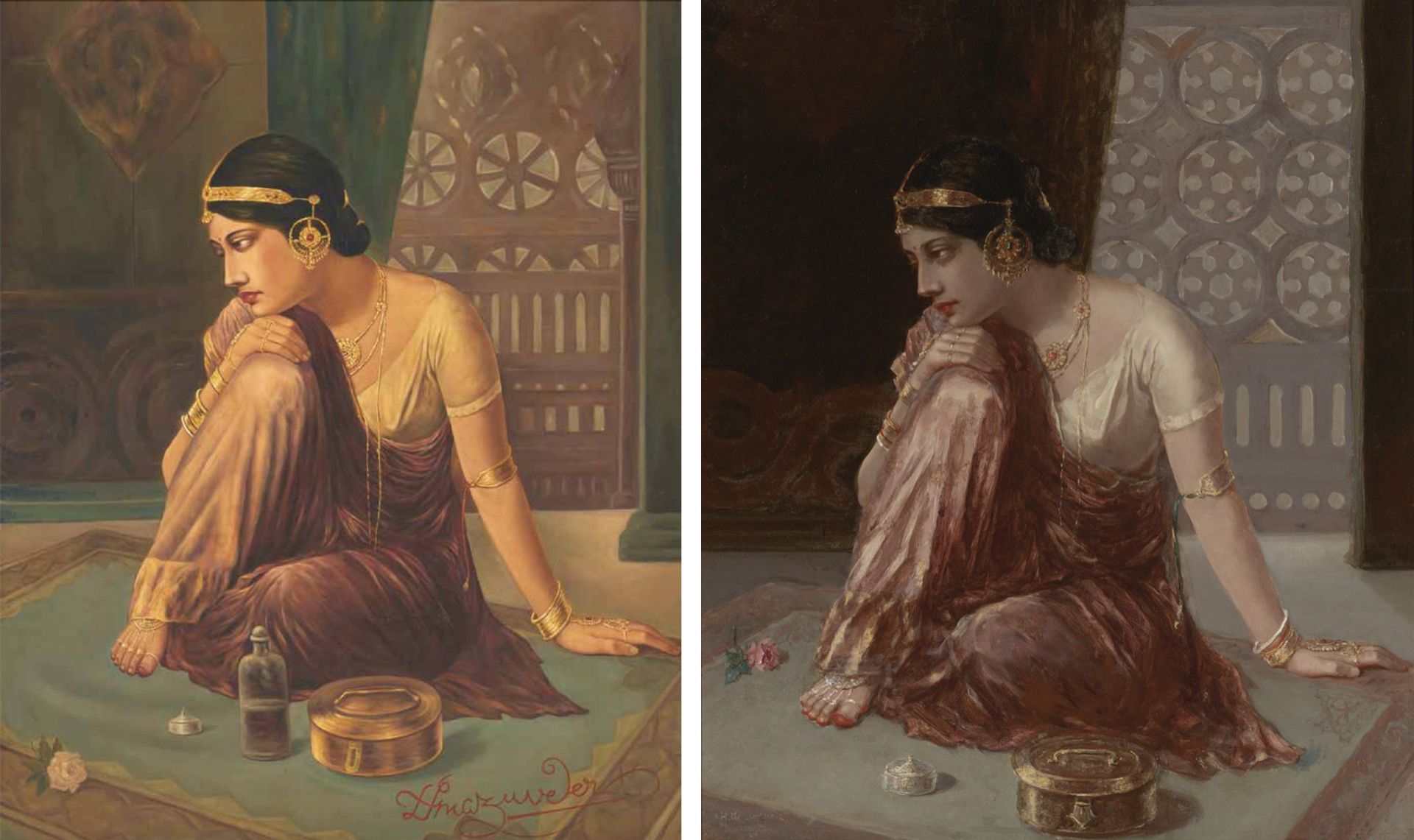 Left: Daydreamer, from the collection of Nirmlya Kumar, attributed to Mazumdar, was exhibited at Soas. Right: an untitled work by Mazumdar that was sold at Sotheby's in 2012