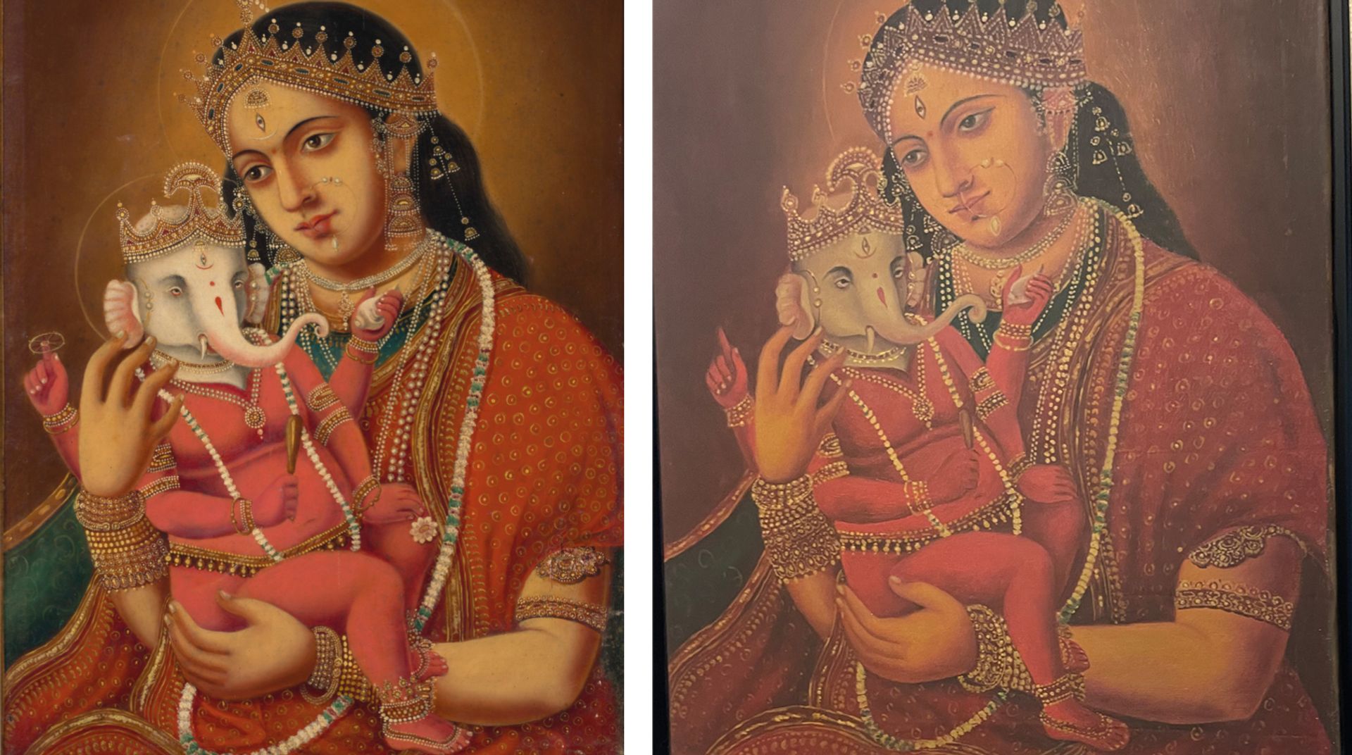 Left: Untitled (Ganesh Janani), bought by the major Indian collector Kiran Nadar from Christie's New York in 2021. Right: the painting Untitled (Parvati and Ganesh) exhibited at Soas