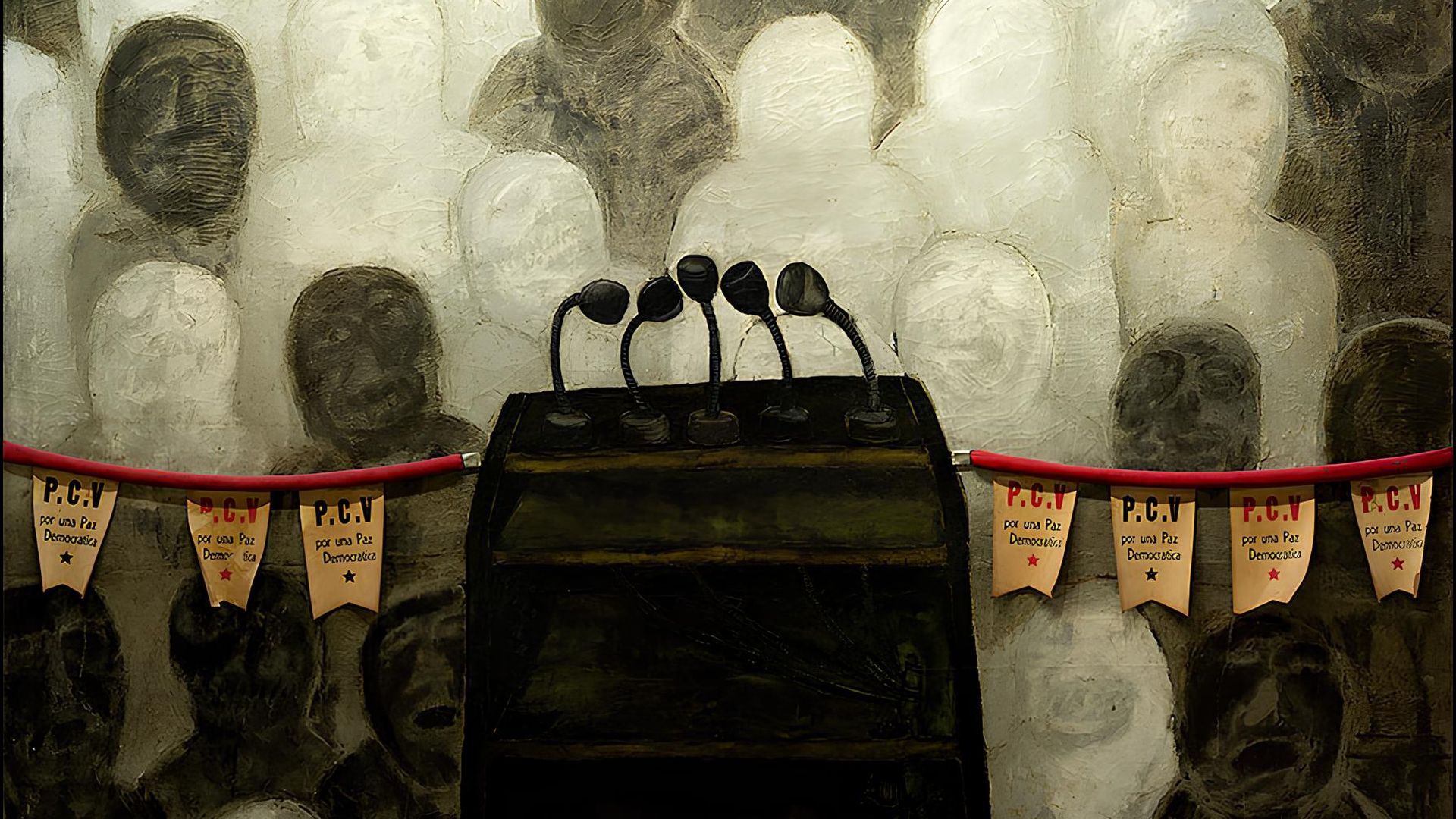 The transcribed words are often enlarged when the speaker is excited, emphasised with colour in El Lissitzky-like fashion and accompanied by a portrait when the speaker is known. When an official of the Cuban government speaks, often under a pseudonym, Coyula animates the late Expressionist painter Antonia Eiriz's (1929–1995) Goya-like grotesques.