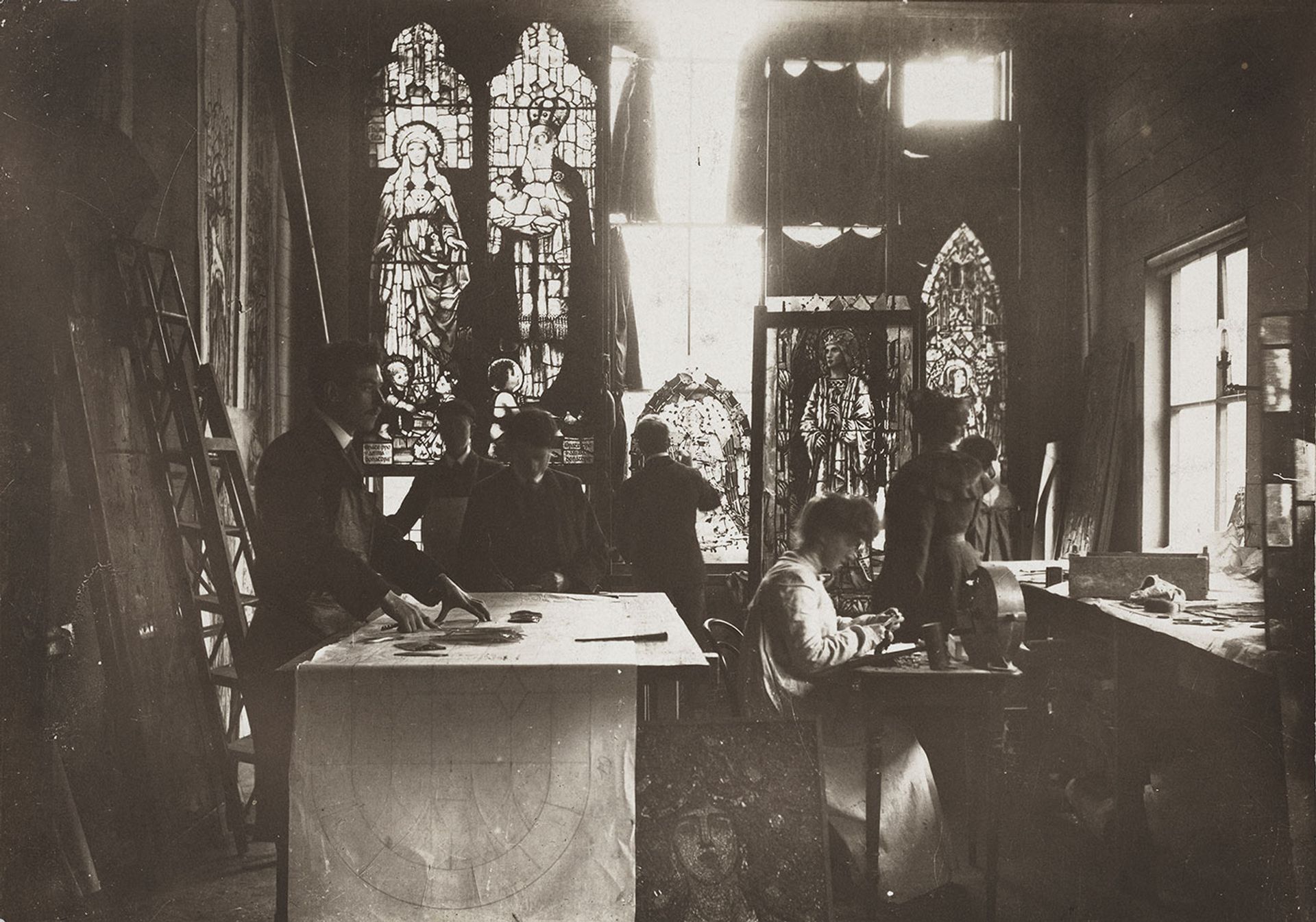 An undated photograph of the An Túr Gloine studio, the stained-glass collective in central Dublin co-founded in 1903 by the artist Sarah Purser. For 10 years from 1933 it was the working base of Evie Hone, who became a stained glass artist of the first rank before her death in 1955 National Gallery of Ireland Collection
