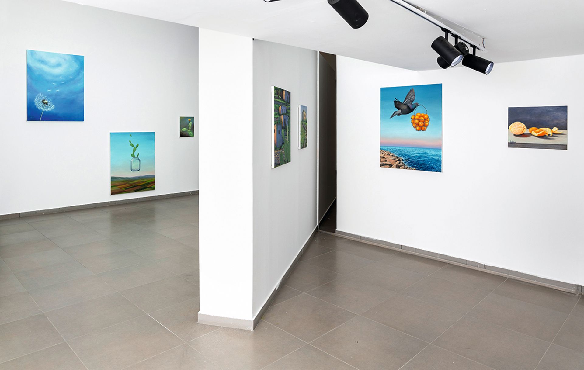 Walid Abu Shakra’s engraved landscapes of Umm el-Fahem and its surroundings is one of the six exhibitions that opened in November. Nearby are painted explorations of personal history and the complexity of Arab Jewish identity in Back to the Levant by Shy Abady. “Abady talks about himself as a person who is Jewish and also Arab,” Abu Shakra says. “It’s very important to hear him speak about that in order to understand how we’re actually not that different from each other.” On the same floor is an exhibition of recent paintings by the Palestinian artist Sobhiya Hasan Qais that confront the humanitarian crisis and starvation in Gaza.